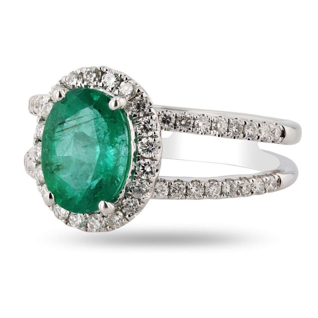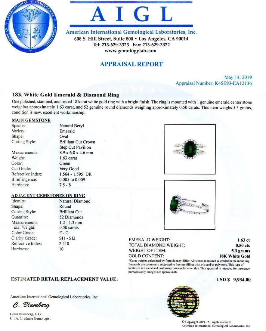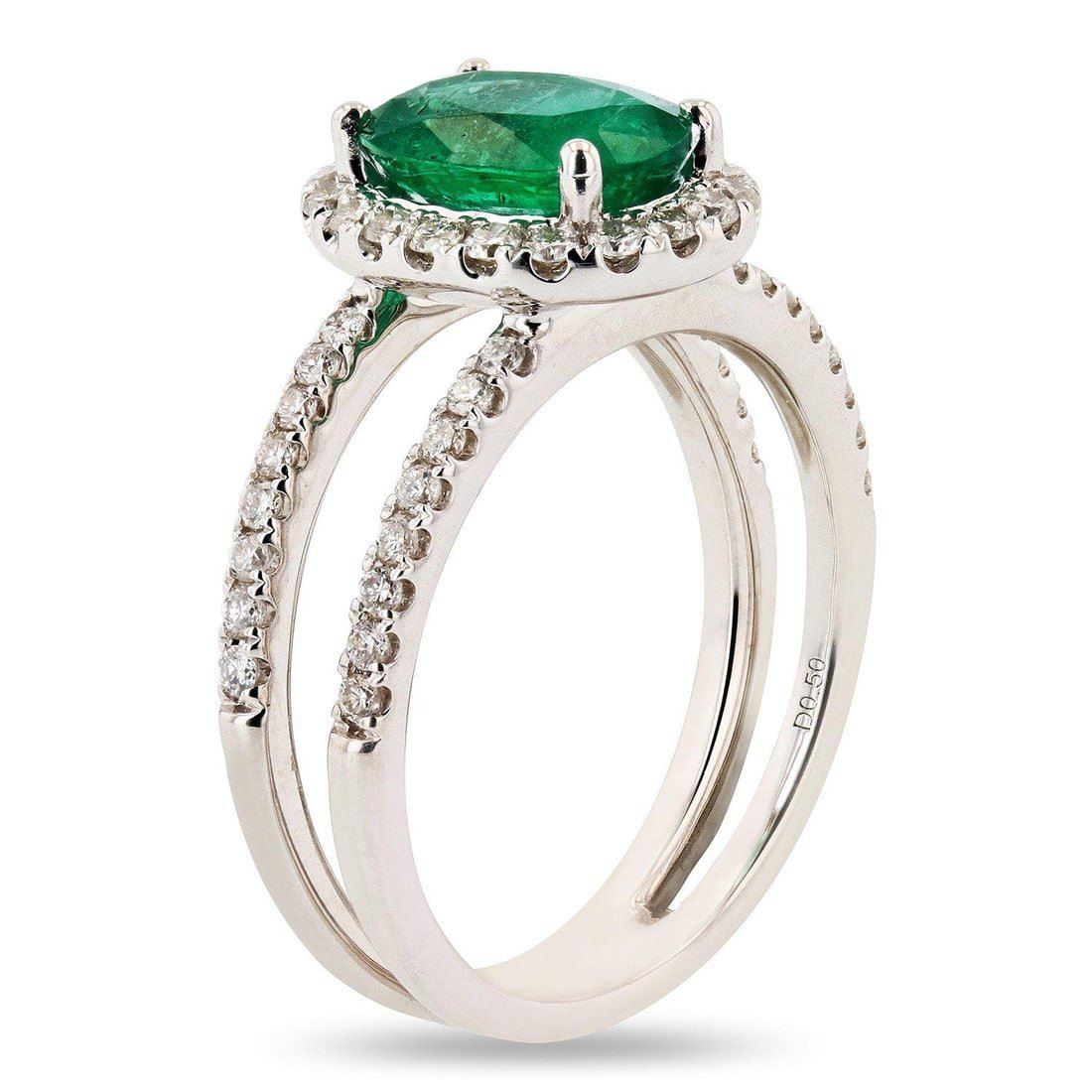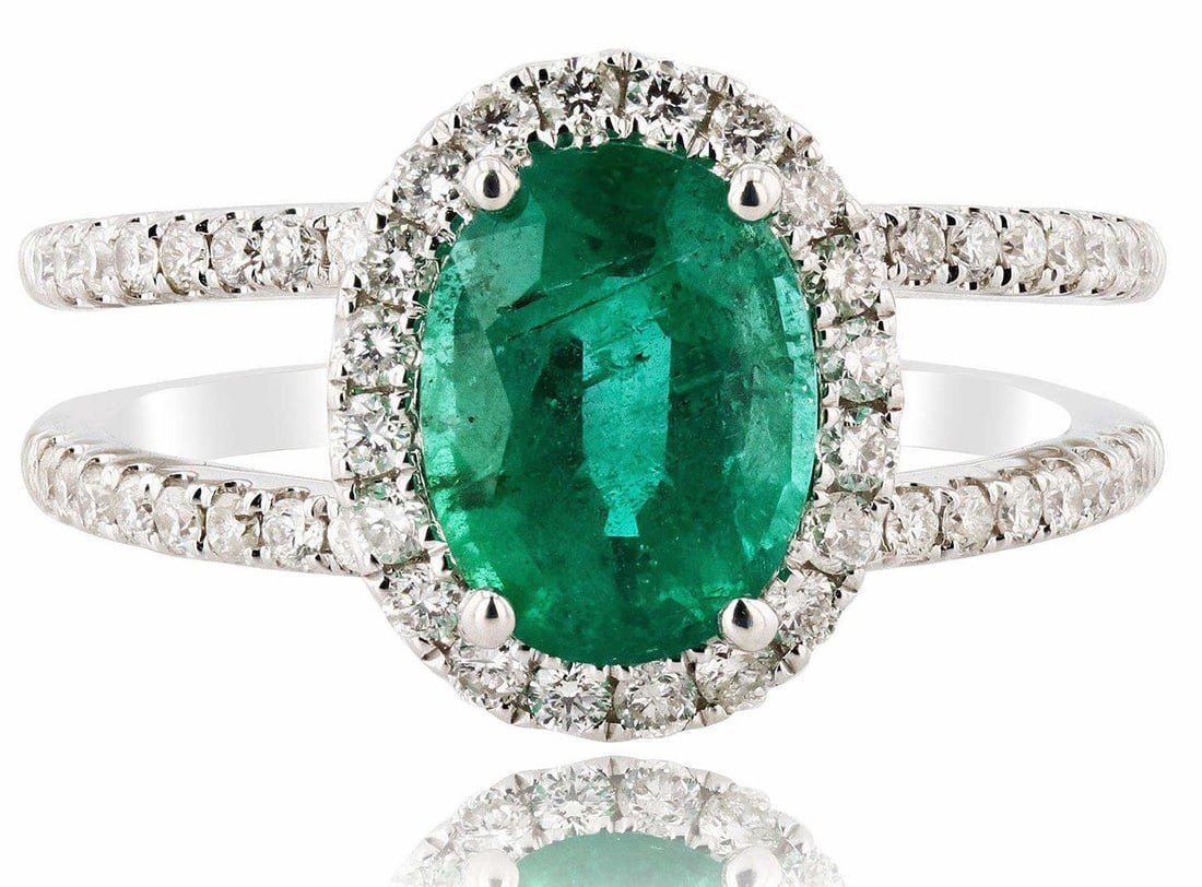 18K White Gold Emerald & Diamond Ring One polished, stamped, and tested 18 karat white gold ring with a bright finish. The ring is mounted with 1 genuine emerald center stone weighing approximately 1.63 carat, and 52genuine round diamonds weighing approximately 0.50 carats. This item weighs 5.3 grams, condition is new, excellent workmanship. MAIN GEMSTONE Species: Natural Beryl Variety: Emerald Shape: Oval Cutting Style: BrilliantCut Crown Step Cut Pavilion Measurements: 8.9 x 6.8 x 4.6mm Weight: 1.63 carat Color: Green Cut Grade: Very Good Refractive Index: 1.564 - 1.595 DR Birefringence: 0.005 0.009 Hardness: 7.5 - 8 ADJACENT GEMSTONES ON RINGIdentity: Natural Diamond Shape: Round Cutting Style: Brilliant Cut Quantity: 52 Diamonds Measurements: 1.2 - 1.3mm Total Weight: 0.50 carats Color Grade: F - G Clarity Grade: SI1 to SI2 Refractive Index:2.418 Hardness: 10 EMERALD WEIGHT: 1.63ct TOTAL DIAMOND WEIGHT: 0.50ctw WEIGHT OF ITEM: 5.3 grams GOLD CONTENT: 18K White Gold