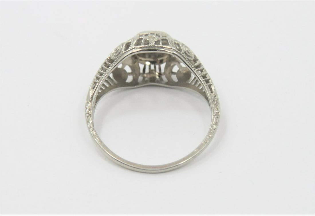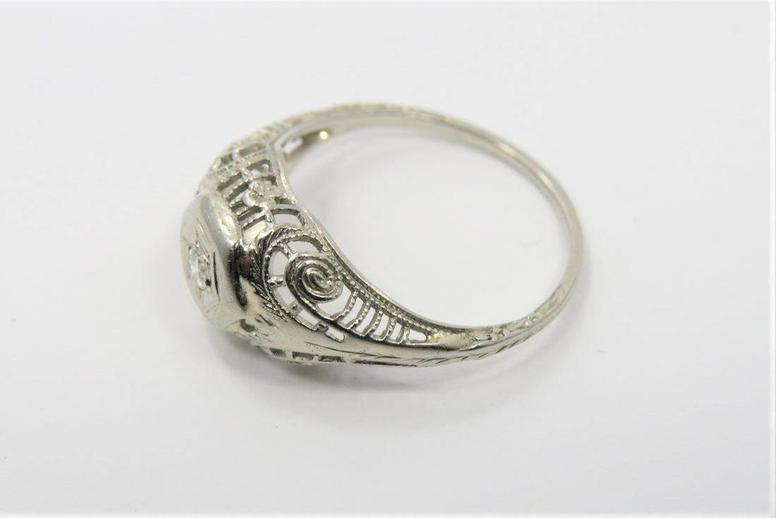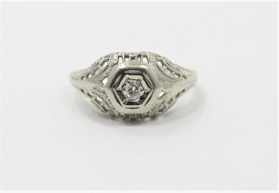 Stamped 18K white gold vintage diamond ring. Filigree etched shank with 0.05 ct center diamond. Ring size 5.75. Weighs approximately 2.1 grams.