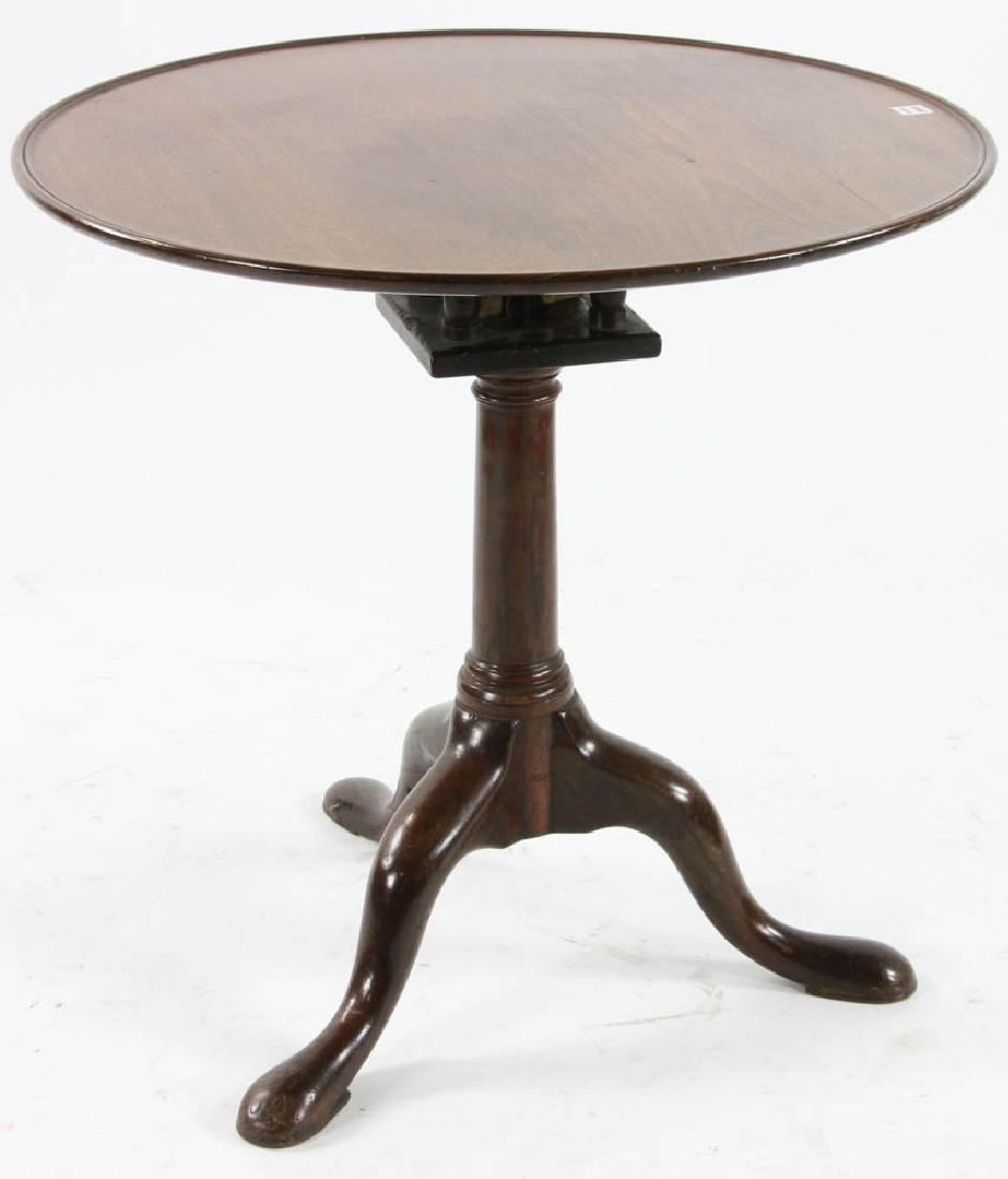 18th century English mahogany tilt-top tea table, dish top, birdcage center and pad feet. Provenance: Vero Beach, Florida estate.