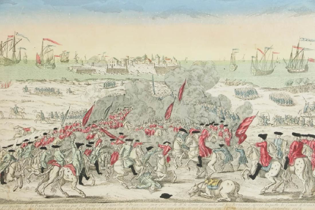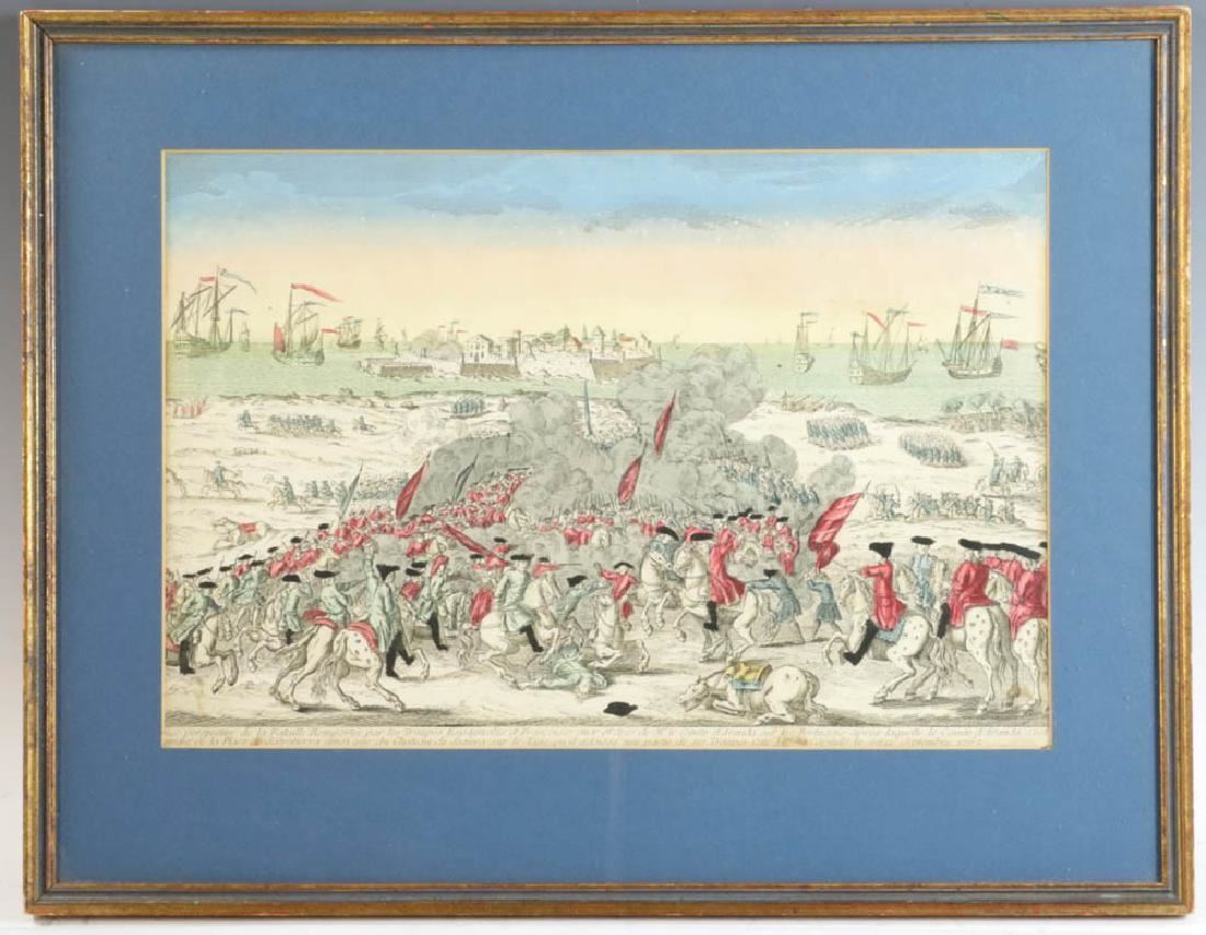 18th century antique Red Coats French hand-colored print, dated September, 1762, 10 1/2" x 15", framed 15 1/2" x 20". Provenance: Governor Ichabod Goodwin estate.