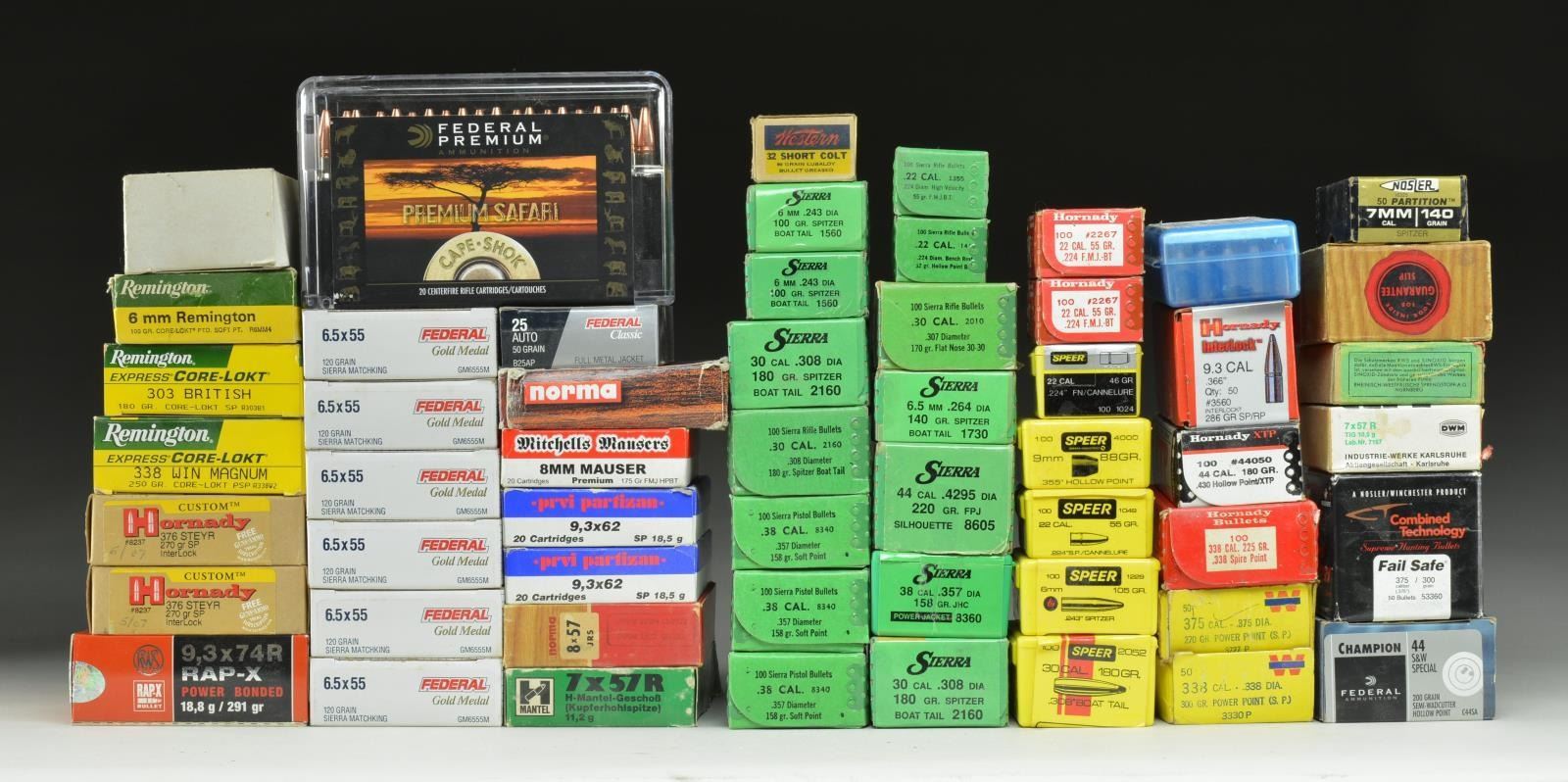 BULLETS: 25 Full boxes of various cals. & makers; primarily Sierra. Also included are 5 partial boxes. CONDITION: box exteriors appear good to very good, ammo appears serviceable. (02-16693/MD). $300-600.