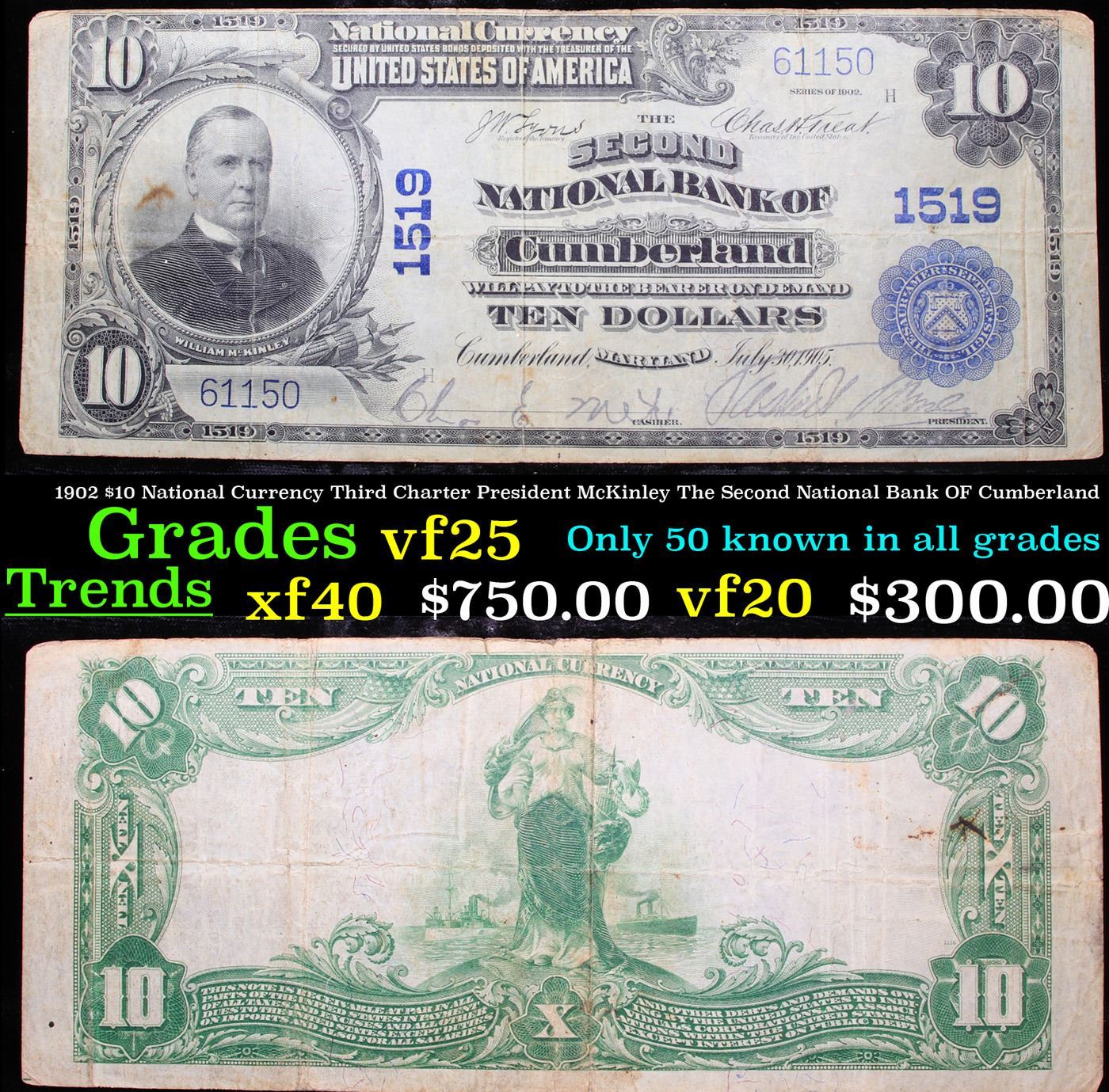 1902 $10 National Currency Third Charter President McKinley The Second National Bank OF Cumberland Grades vf+. This note belongs to an important series of United States currency in that it is the last type note of National Bank Currency printed in the old larger size. At the beginning of the final charter of notes (1929) all the new notes are made in the new smaller size. This note also features the portrait of William McKinley, who had been shot and killed at the Pan-American Exposition just a few months before the first notes in this series were printed and released bearing his image. National bank notes are different from other nationally printed currency in that they are printed specifically for each individual chartered bank organization. This assisted greatly in creating a system of bank notes that were the same across the country. This aided in travelers knowing what they were spending and receiving in change, rather than the times when each bank and state printed their own currency with their own designs. The National Bank Note system was abandoned shortly after the changeover to smaller size notes in 1929, making the third charter notes the last truly used issue of this kind.