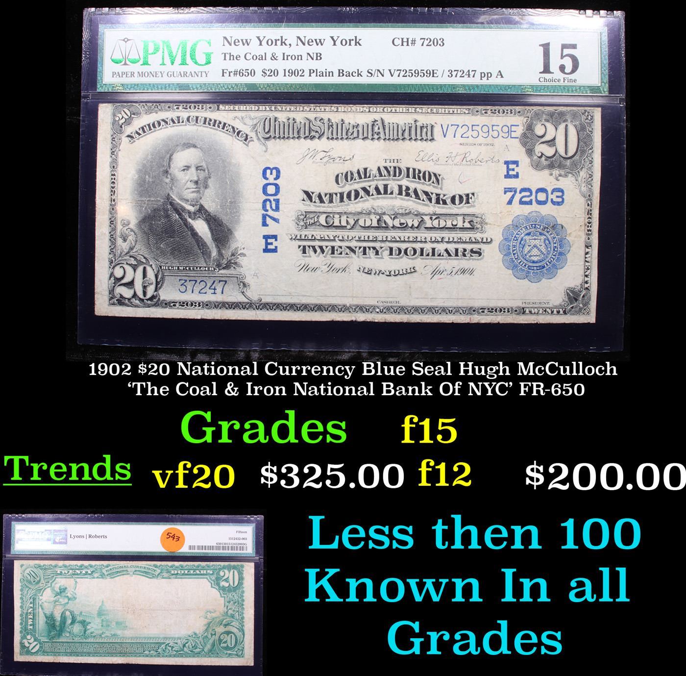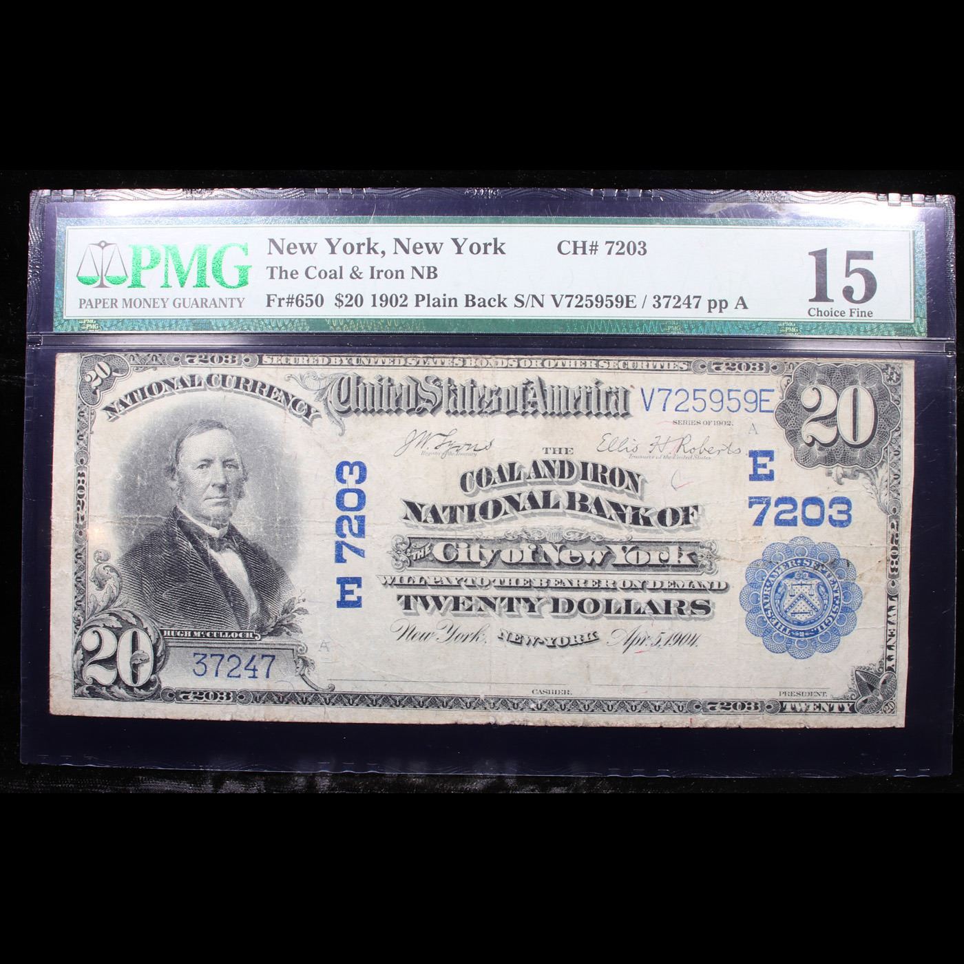 1902 $20 National Currency Blue Seal Hugh McCulloch 'The Coal & Iron National Bank Of NYC' FR-650 GRaded f15 By PMG. The series of 1902 Hugh McCulloch twenty dollar blue seal national bank was issued by national banks in all fifty states and even in Puerto Rico as well. National bank notes are different from other nationally printed currency in that they are printed specifically for each individual chartered bank organization. This assisted greatly in creating a system of bank notes that were the same across the country. This aided in travelers knowing what they were spending and receiving in change, rather than the times when each bank and state printed their own currency with their own designs. The National Bank Note system was abandoned shortly after the changeover to smaller size notes in 1929, making the third charter notes the last truly used issue of this kind.