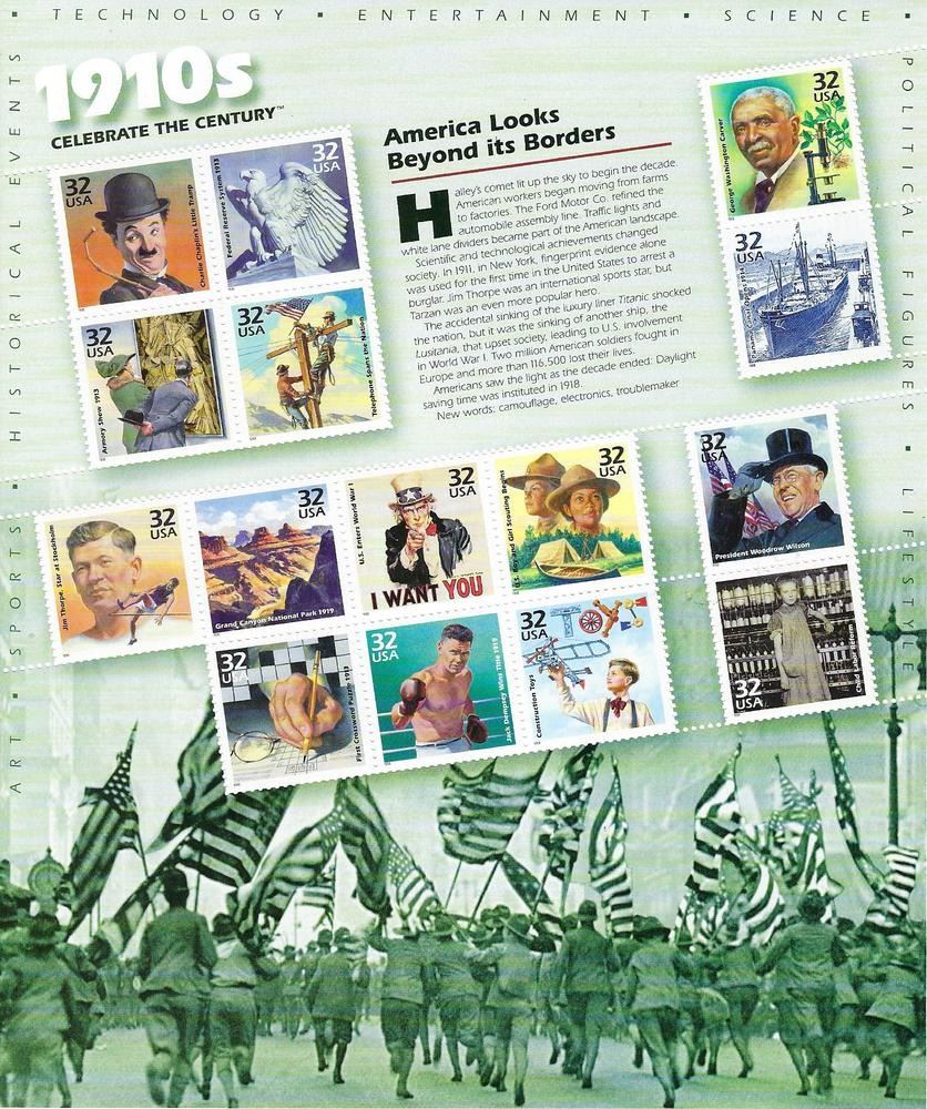 Celebrate the Century 1910s, Full Sheet of 15 x 32-Cent Postage Stamps, USA 1998, Scott 3183