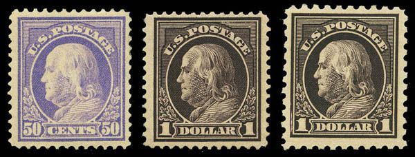 * 1912, 50 Violet, Dl Watermark, Also $1 Violet Brown and 1915, $1 Violet Black. O.g. (first two glazed gum). Fresh and well centered. Very Fine.