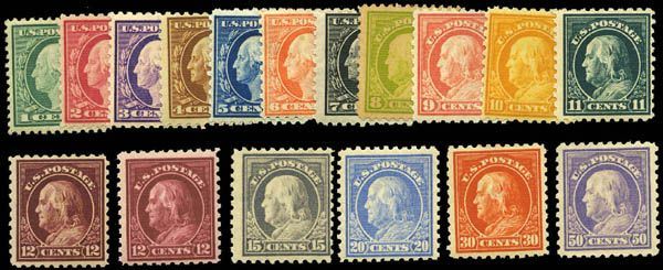 * 1913-15, 1-50 Washington-Franklins Complete. Including both major shades of the 12. O.g. Mostly fresh and well centered. 8 toned. Otherwise Fine to Very Fine.