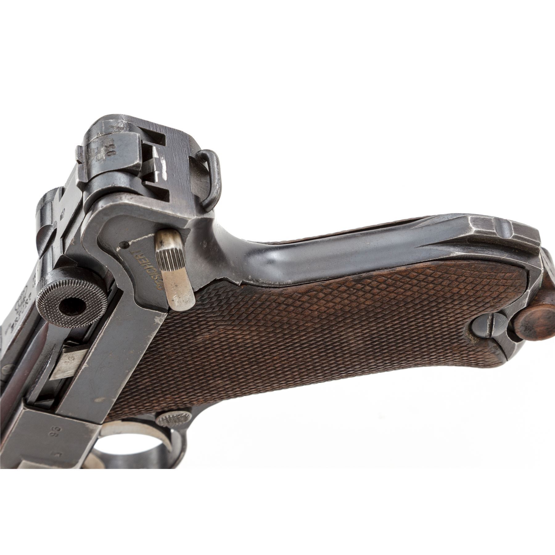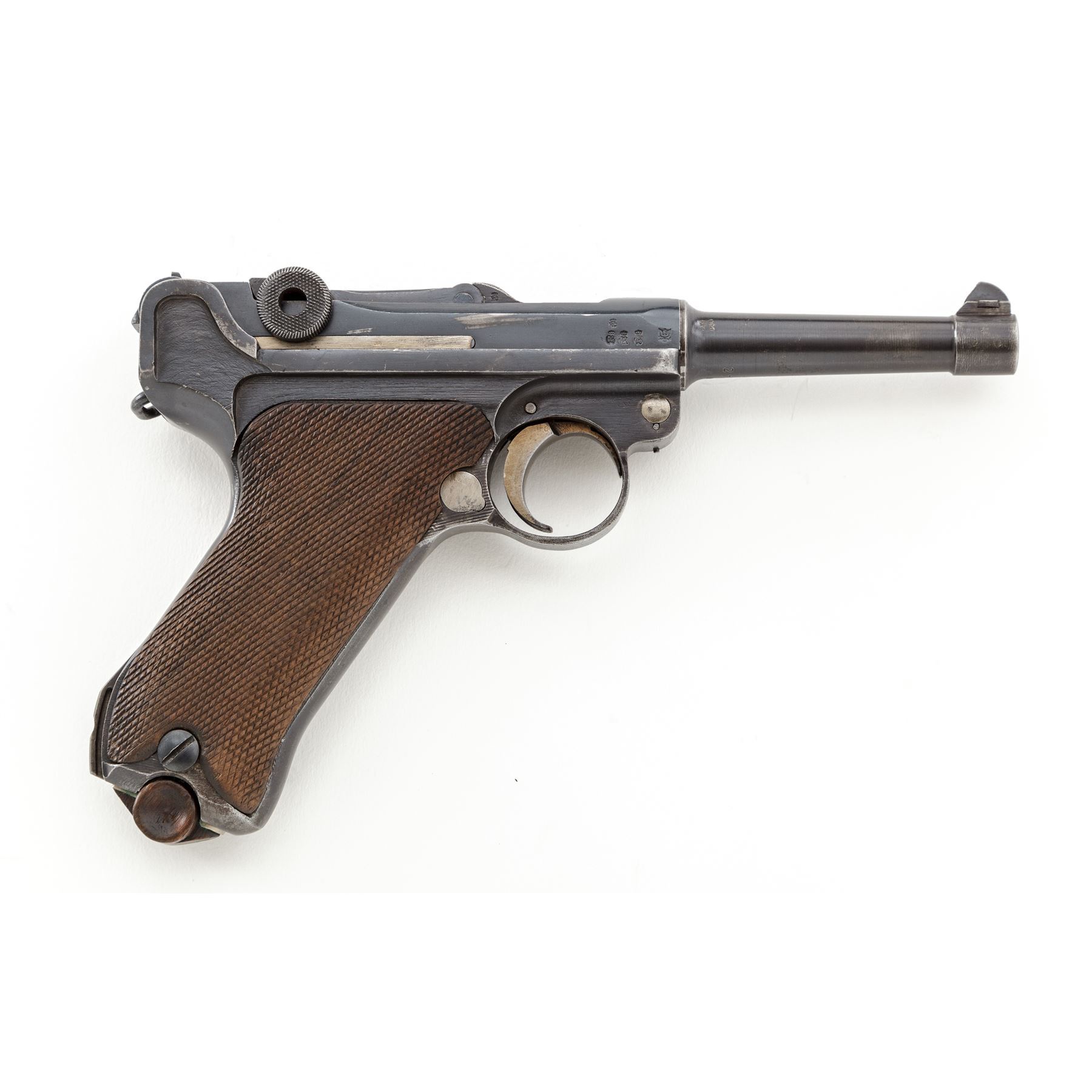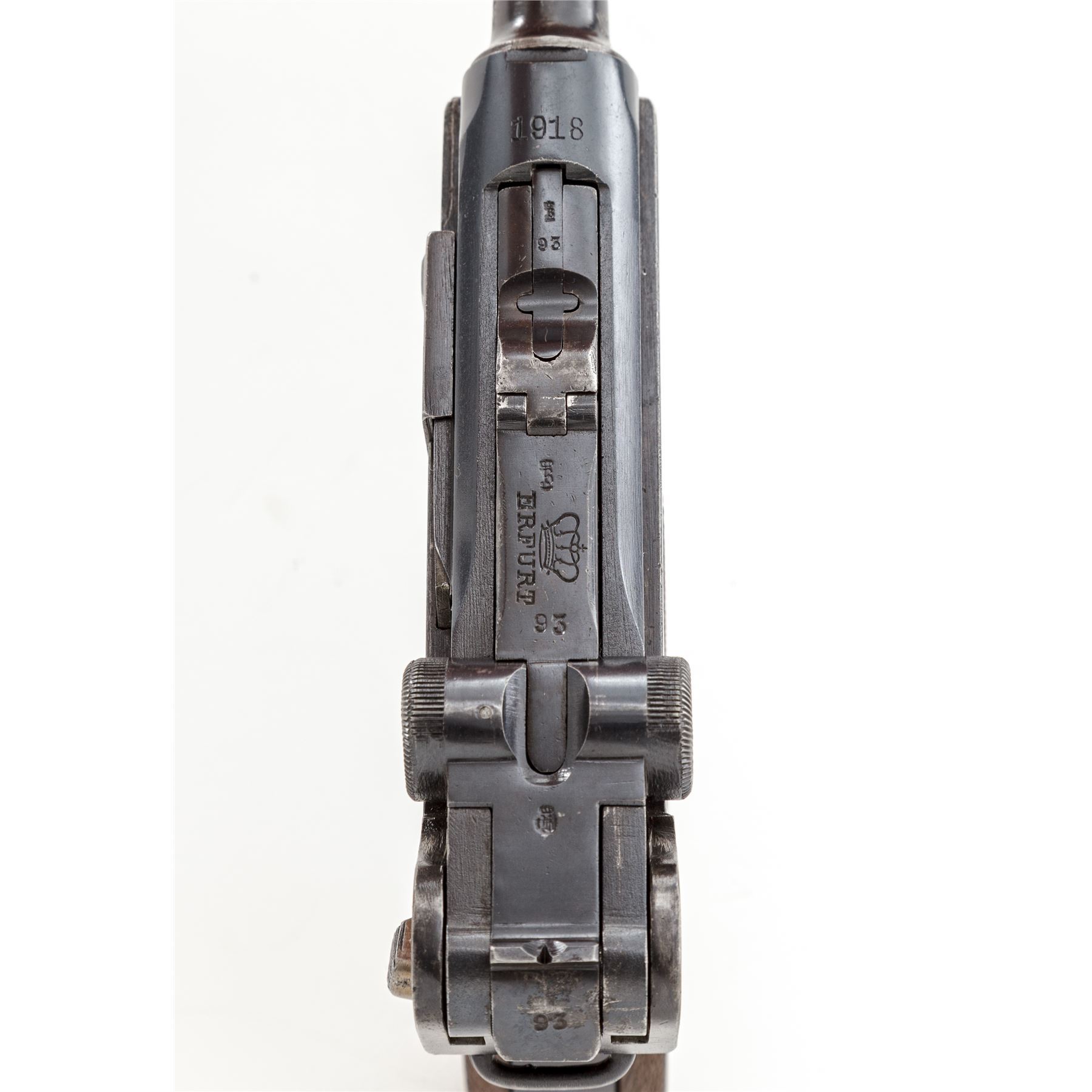 1914 P.08 Erfurt Luger, #2793p, 9mm, 4'' barrel, rust blued finish, straw small parts, checkered walnut grips, one matching numbered tin-plated magazine with wood base. Chamber dated 1918, toggle marked with large crown over ''Erfurt'', with all visible numbers matching, except grips. Action functions properly. Erfurt Imperial proof marks on right side of slide, firing proofs on slide and barrel. Most all the small parts except the mag release are marked with the Erfurt proofmark, as is the extractor, toggle center and rear. Magazine wood base is stamped with the serial number and letter, ''+'', and Erfurt proof. Grips panels are marked ''82'' internally, with Geischert/Geladen thumb safety and extractor. Condition is very good retaining approx. 75%-80% original finish, with light holster wear on muzzle sides, front and side of frame and side cover. Barrel has a thinning to the finish and some light pitting on the muzzle ring. There is wear to the finish, with some light pinprick pitting on top of front section of toggle, back of rear portion of toggle, and frame/slide ears. Front gripstrap shows wear and finish is fading to a gray color; rear gripstrap has some light wear on the high edges and center grip area. Straw finish on the trigger is approx. 60%; takedown lever, safety lever, and slide spring at approx. 80%. Grip screw slots show a little wear and screws are possibly refinished. Grip panels show light wear with a few flattened diamonds. Action functions properly; bore is good with very light frosting of pitting and strong lands/grooves. Est.: $600-$900. (C&R)