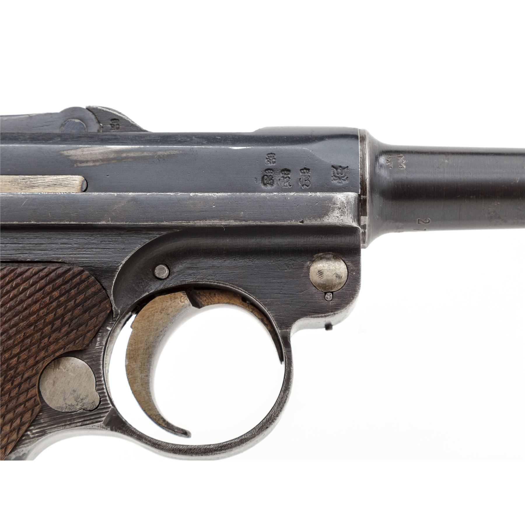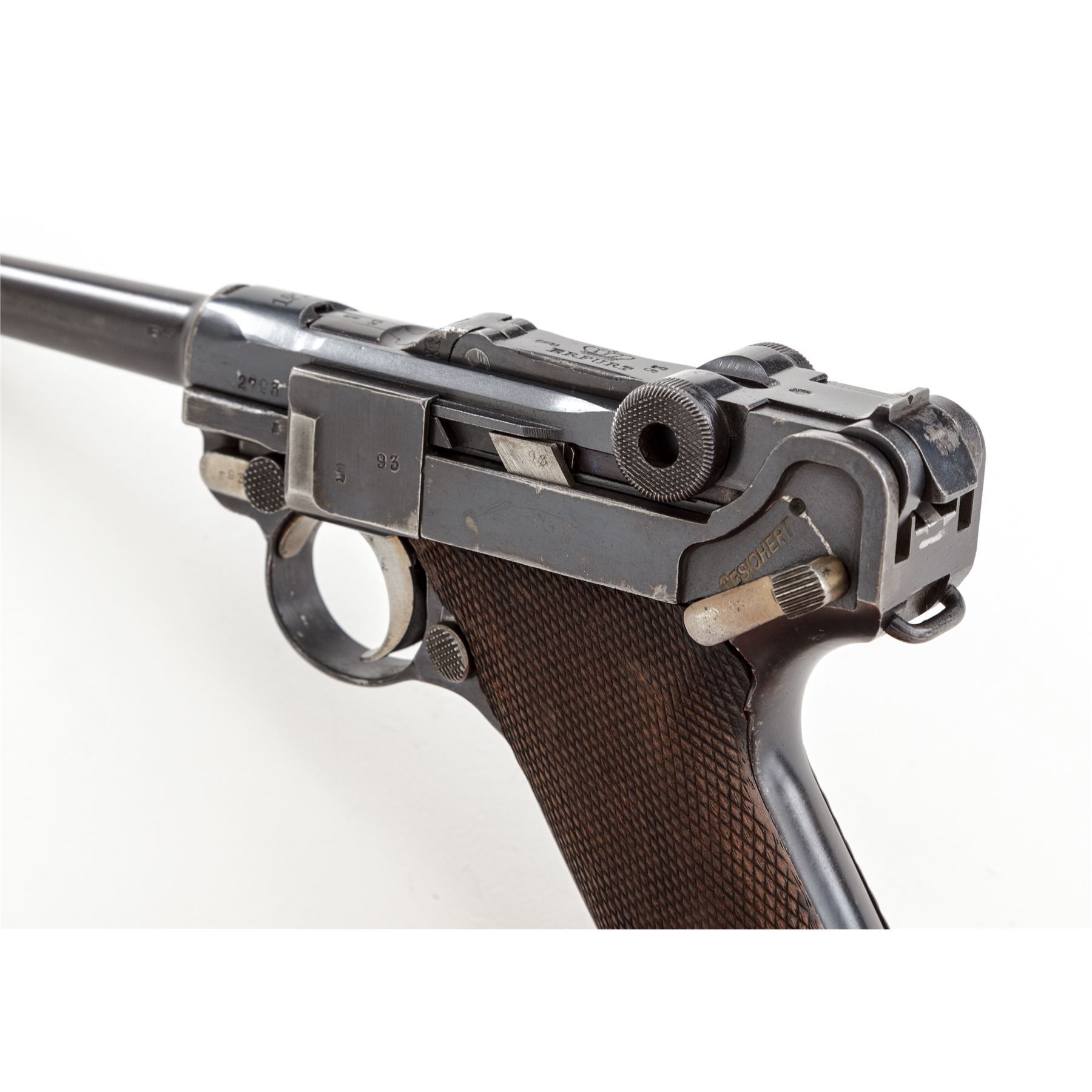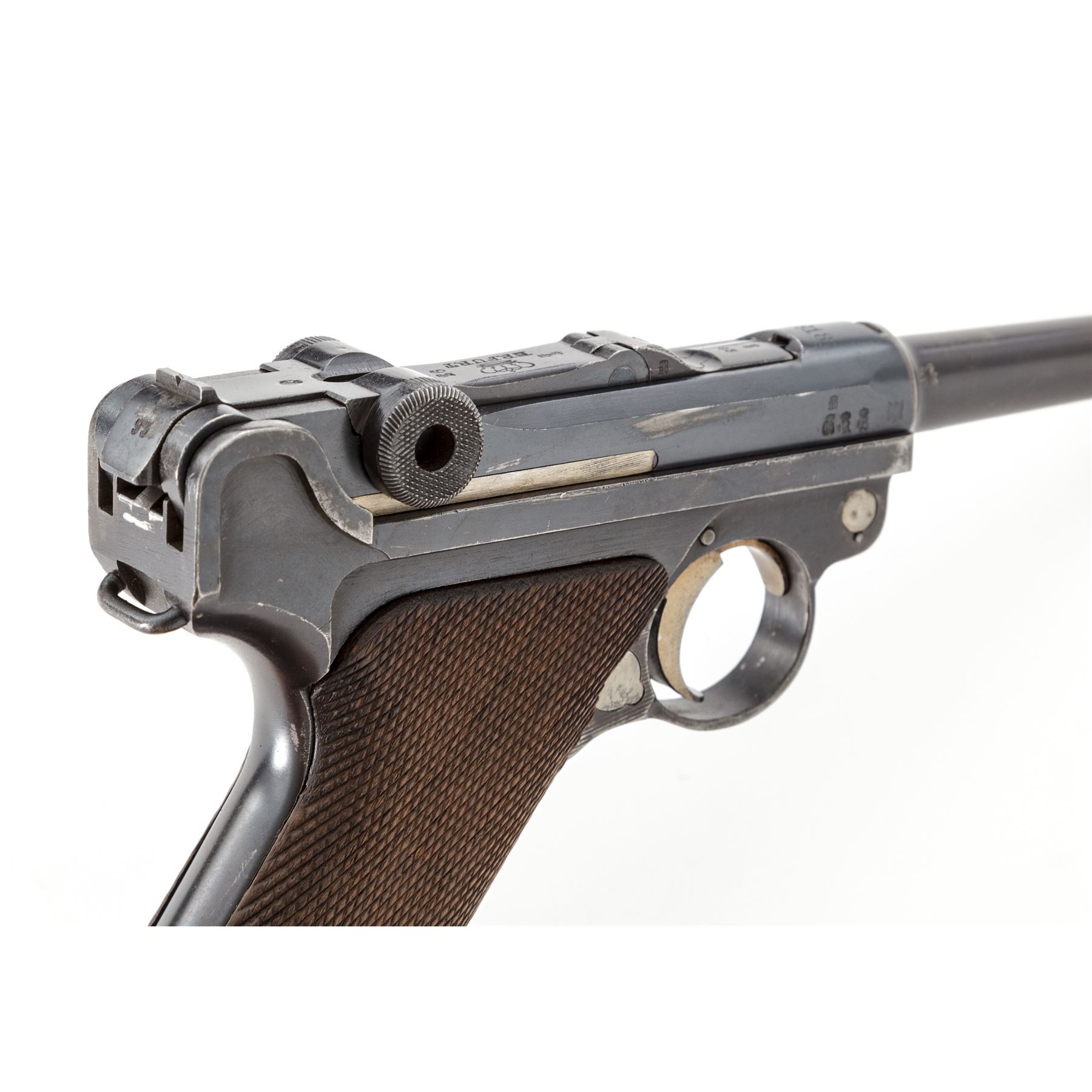 1914 P.08 Erfurt Luger, #2793p, 9mm, 4'' barrel, rust blued finish, straw small parts, checkered walnut grips, one matching numbered tin-plated magazine with wood base. Chamber dated 1918, toggle marked with large crown over ''Erfurt'', with all visible numbers matching, except grips. Action functions properly. Erfurt Imperial proof marks on right side of slide, firing proofs on slide and barrel. Most all the small parts except the mag release are marked with the Erfurt proofmark, as is the extractor, toggle center and rear. Magazine wood base is stamped with the serial number and letter, ''+'', and Erfurt proof. Grips panels are marked ''82'' internally, with Geischert/Geladen thumb safety and extractor. Condition is very good retaining approx. 75%-80% original finish, with light holster wear on muzzle sides, front and side of frame and side cover. Barrel has a thinning to the finish and some light pitting on the muzzle ring. There is wear to the finish, with some light pinprick pitting on top of front section of toggle, back of rear portion of toggle, and frame/slide ears. Front gripstrap shows wear and finish is fading to a gray color; rear gripstrap has some light wear on the high edges and center grip area. Straw finish on the trigger is approx. 60%; takedown lever, safety lever, and slide spring at approx. 80%. Grip screw slots show a little wear and screws are possibly refinished. Grip panels show light wear with a few flattened diamonds. Action functions properly; bore is good with very light frosting of pitting and strong lands/grooves. Est.: $600-$900. (C&R)