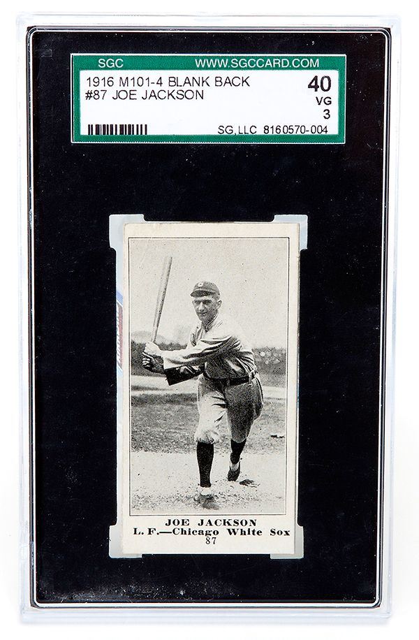 1916 Joe Jackson Baseball Card. M101-4 Sporting News #87 vintage baseball card measuring 3"x 1�" with blank back authenticated and encapsulated by SGC (Sports Card Guaranty). Condition 40 VG3. Very Good 3.
