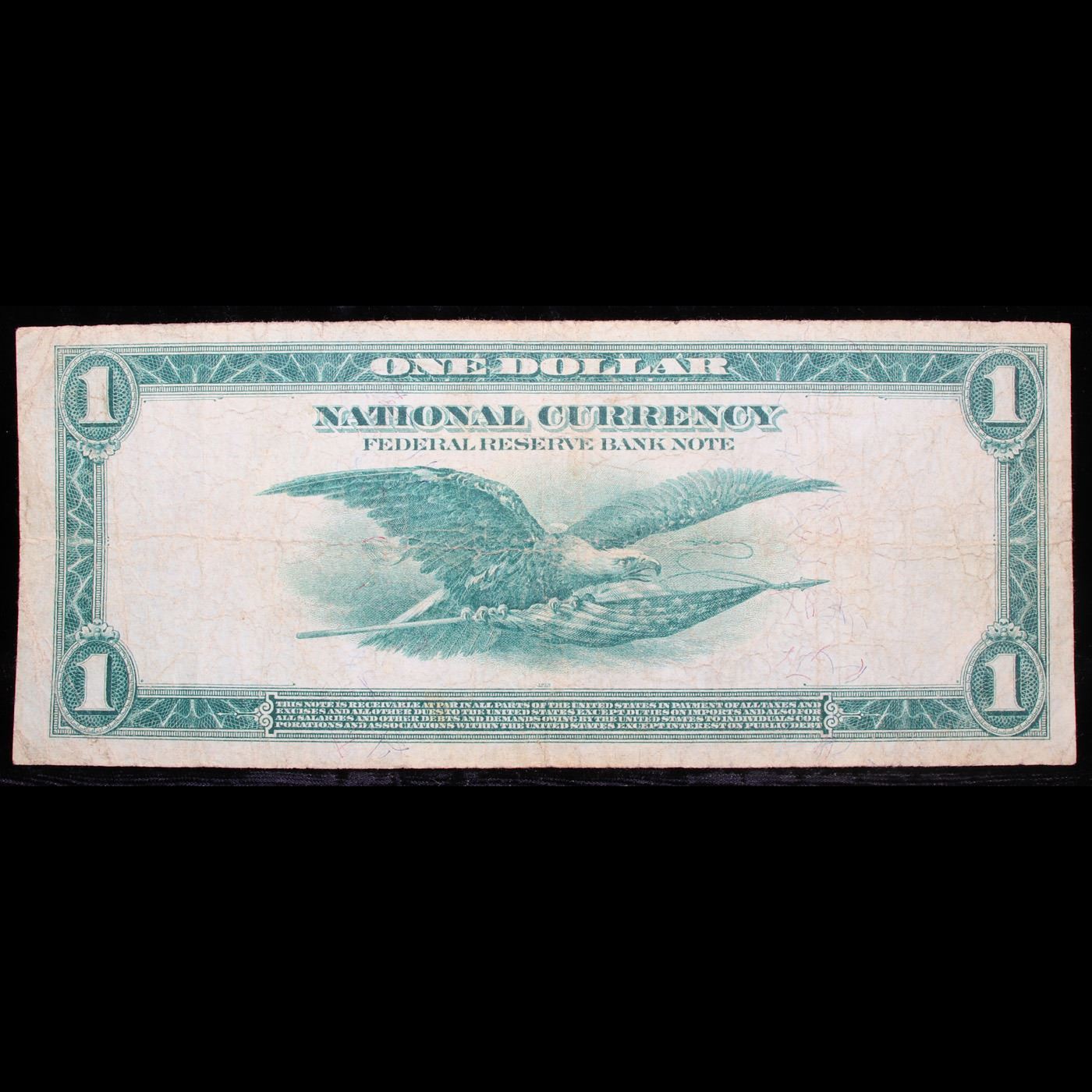 1918 $1 National Currency Federal Reserve Bank of Richmond, VA fr-722 "Flying Eagle" Grades vf++. There are three different years found on series of 1918 one dollar bills. Despite also saying 1914 and 1913, these are referred to by collectors as 1918 federal reserve bank notes. Collectors have given this note the nickname of the “Flying Eagle.” The back of the note shows why the bill received its nickname. Keep in mind that series of 1918 one dollar federal reserve bank notes were issued for 12 different banks. The artwork will all be the same though. George Washington is on the left hand side of the bill. There is a blue seal on the right hand side of the bill and the serial numbers are in blue ink.