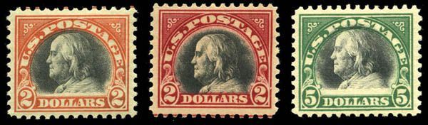 * 1918, $2 Orange Red & Black, Also $5 Deep Green & Black and 1920, $2 Carmine & Black. Glazed o.g. Fresh. Fine to Very Fine.
