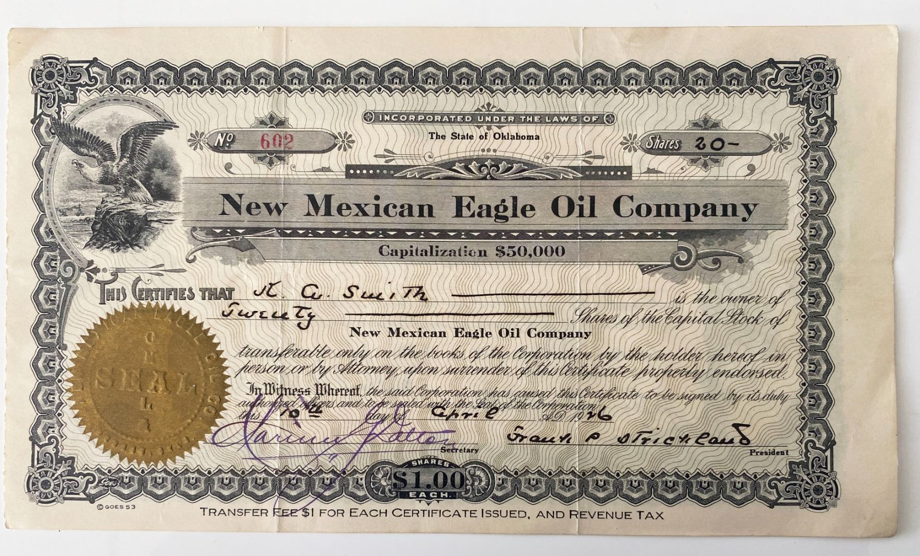 1926 New Mexican Eagle Oil Company Signed Stock Share Certificate.10x6 inches