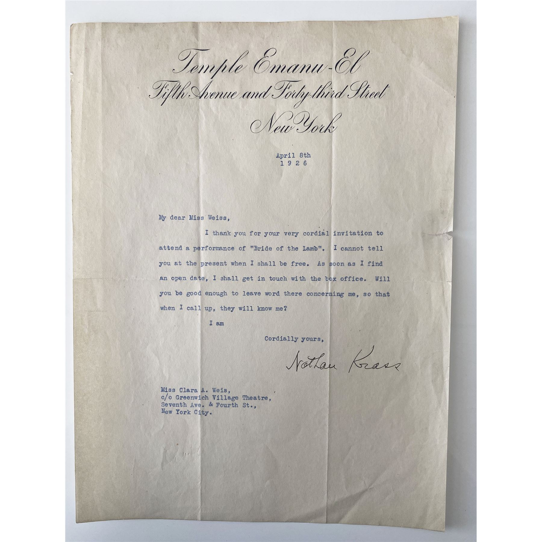 1926 Temple Emanu-El Rabbi Nathan Krass signed letter. 8x11 inches