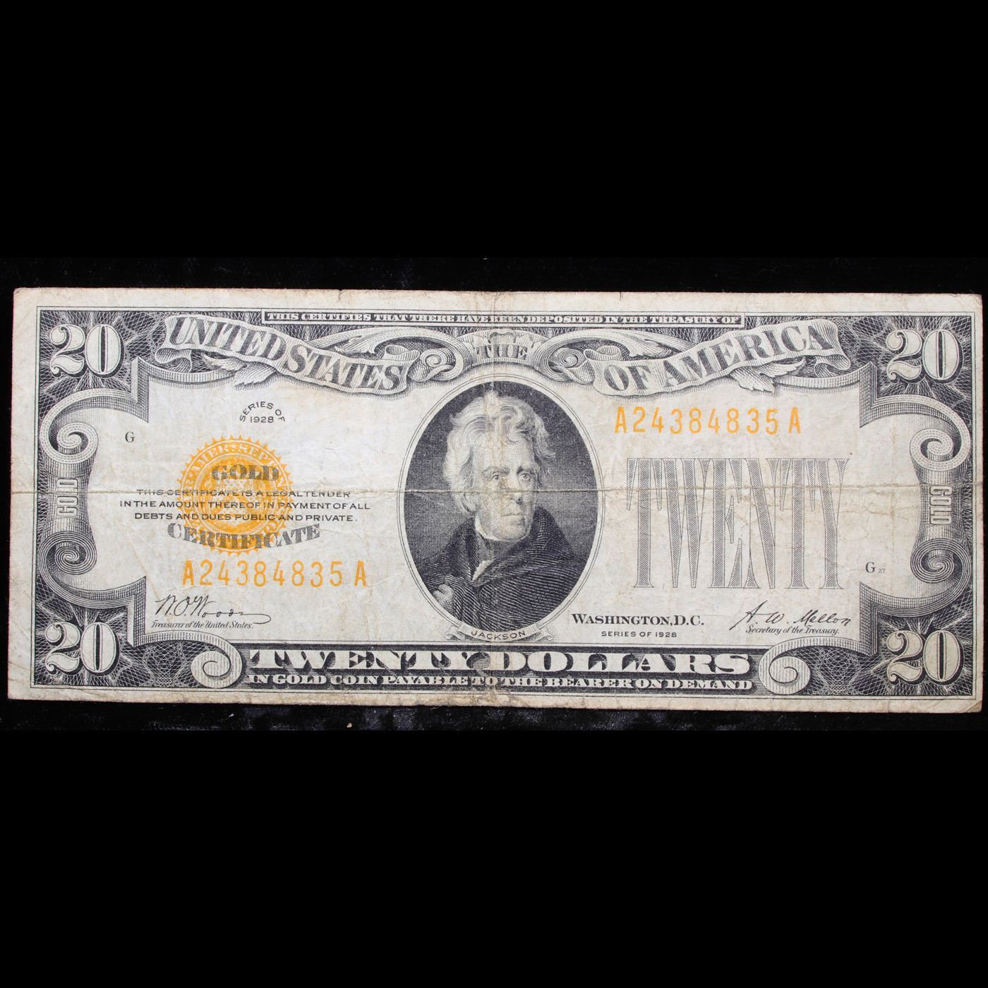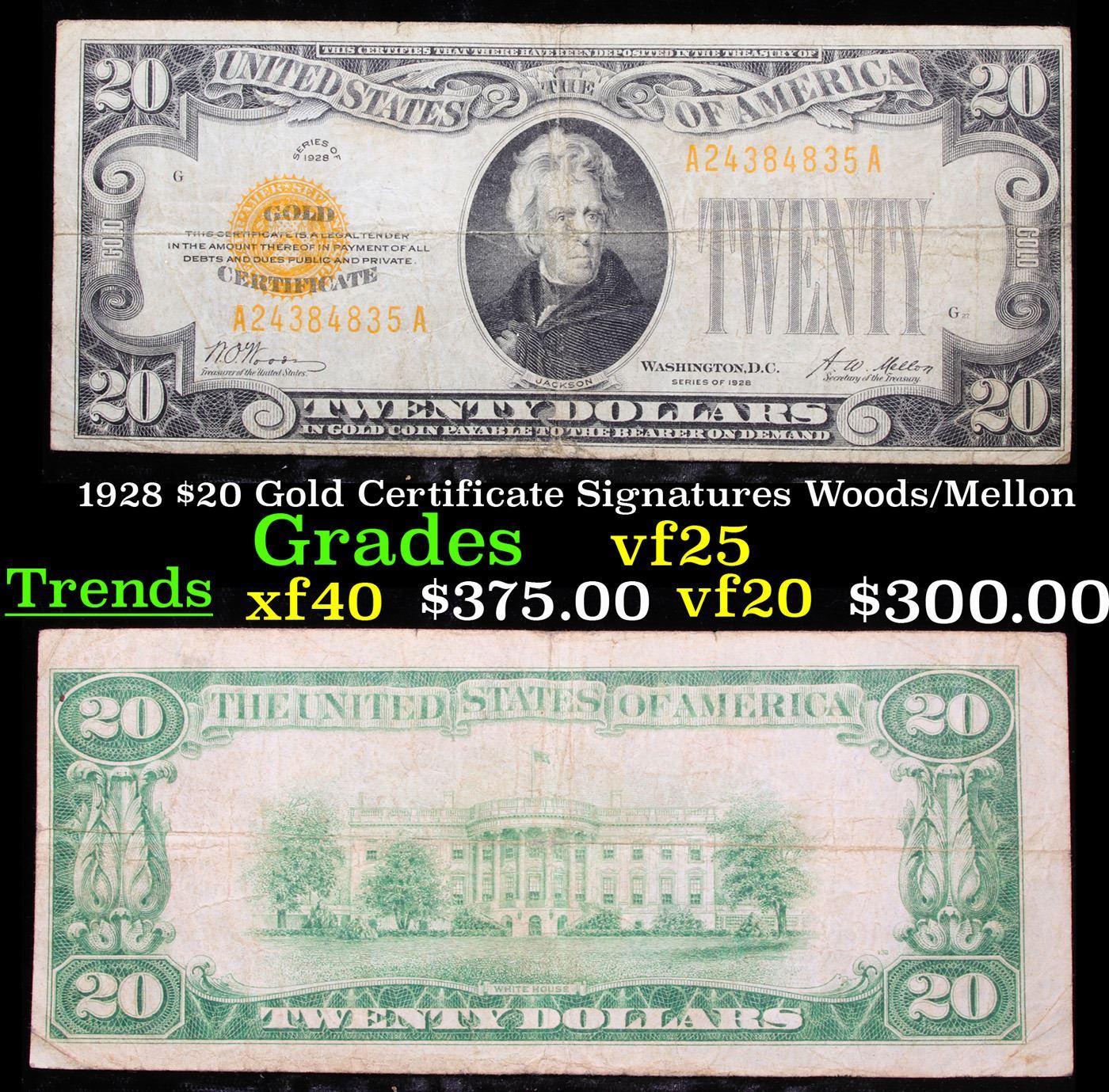 1928 $20 Gold Certificate Signatures Woods/Mellon Grades vf+. The small size $20 gold certificate was only issued for 1928. Like other twenty dollar bills from the same year, this one shows a portrait of Andrew Jackson in the center of the bill. Once redeemable for gold on demand, U.S. Gold Certificates are among the most sought after of all paper currency. The small-size notes of Series 1928 are much scarcer than previous large-size notes issued over a longer period. Signatures Woods/Mellon. Generally speaking, the 1928 $20 gold certificate is noted for its light pasty seal and a dark green reverse printing.
