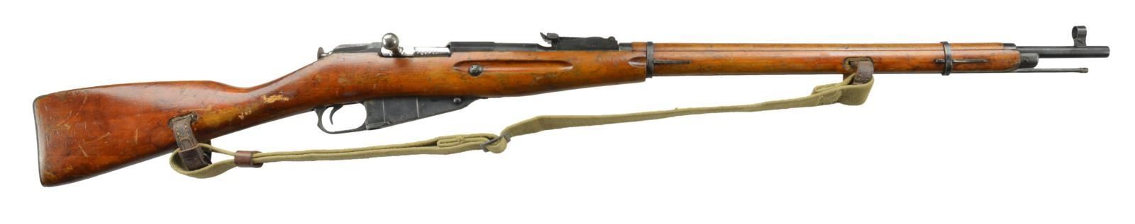 IN 91/30 CONFIGURATION. Cal. 7.62x54R. S# N24424. From 1927 to April 1930, the Tula Arsenal was involved in trials that eventually became the Model 91/30, issuing the configuration in mid 1930. Matching numbered CAI import marked 28.7" bbl., bolt, mag. floorplate & buttplate. Protected post front sight & Tangent 2,000m rear sight. Hex receiver w/ bbl. shank having Tula Arsenal 5 line stamp & 1928 date. Hardwood stock set w/ cleaning rod & khaki sling on leather "dog collars". CONDITION: good overall as arsenal refinished w/ moderate handling marks throughout. Good bore w/ strong rifling. PROVENANCE: from the estate collections of Charles P. Obremski. (22-1337/MD). CURIO. $300-400.