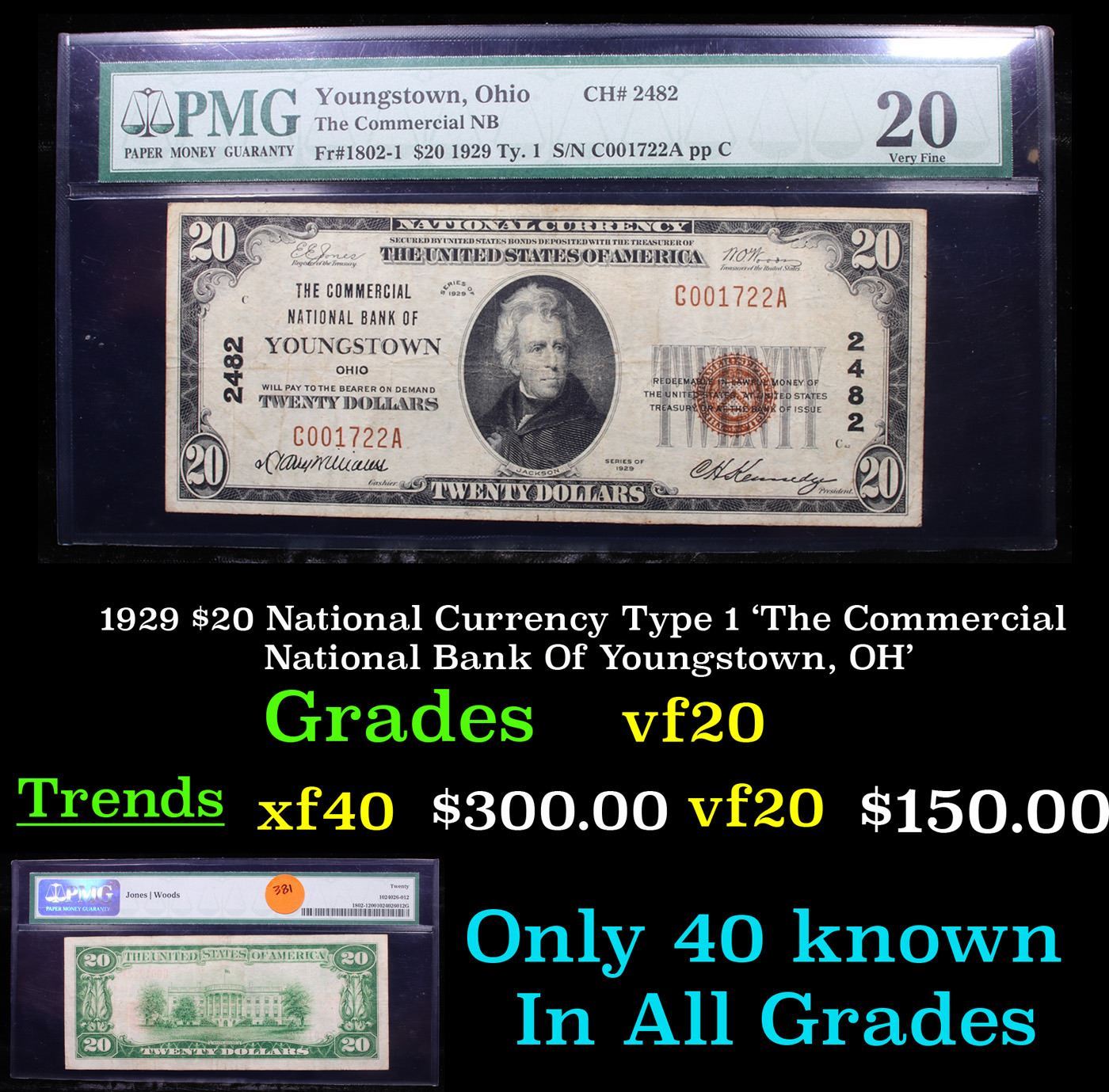 1929 $20 National Currency Type 1 'The Commercial National Bank Of Youngstown, OH' GRaded vf20 By PMG. Series of 1929 national bank notes come in two varieties. Collectors call these type 1 and type 2 varieties. Type 1 1929 $20 national bank notes have a serial number that ends with the letter A. Type 2 1929 $20 national bank notes have a serial number that ends with a number. The charter number is also printed in brown ink twice on type 2 1929 $20 bills. Backed by bonds deposited with the Federal Government, this kind of money says “National Currency” at the top center of the note. These notes were issued by banks who received a Charter from the United States government allowing them to issue money. The Government Printing Office printed these notes with the same design except for the name of the banks, signatures of the bank officers and the Charter number. National Currency notes were made from 1863 to 1929. These notes were a way of creating confidence in an always shaky banking system. Member banks were required to deposit bonds with the government. The bank could then issue currency equal to 90% of the amount of the bonds. The financial panic of 1929 destroyed many of the National Banks and put an end to this system.There were more than 14,000 banks that issued National Currency and there are large numbers of avid collectors. The 1929 issue was the only “small size” issue, that is to distinguish from the “horse blanket” size notes of years previous to 1929.
