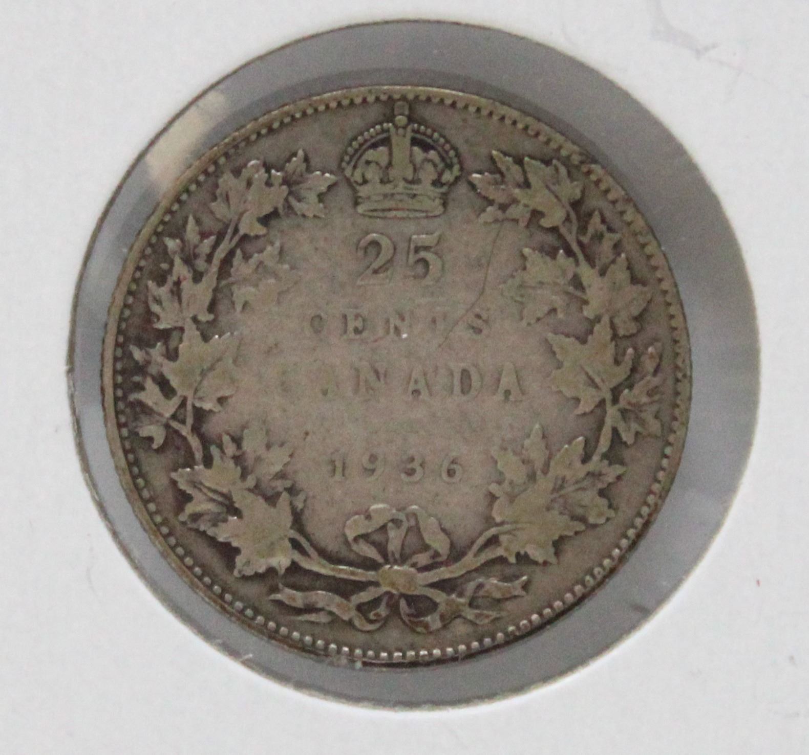 1936 SILVER CANADA 25 CENTS COIN, VERY GOOD -