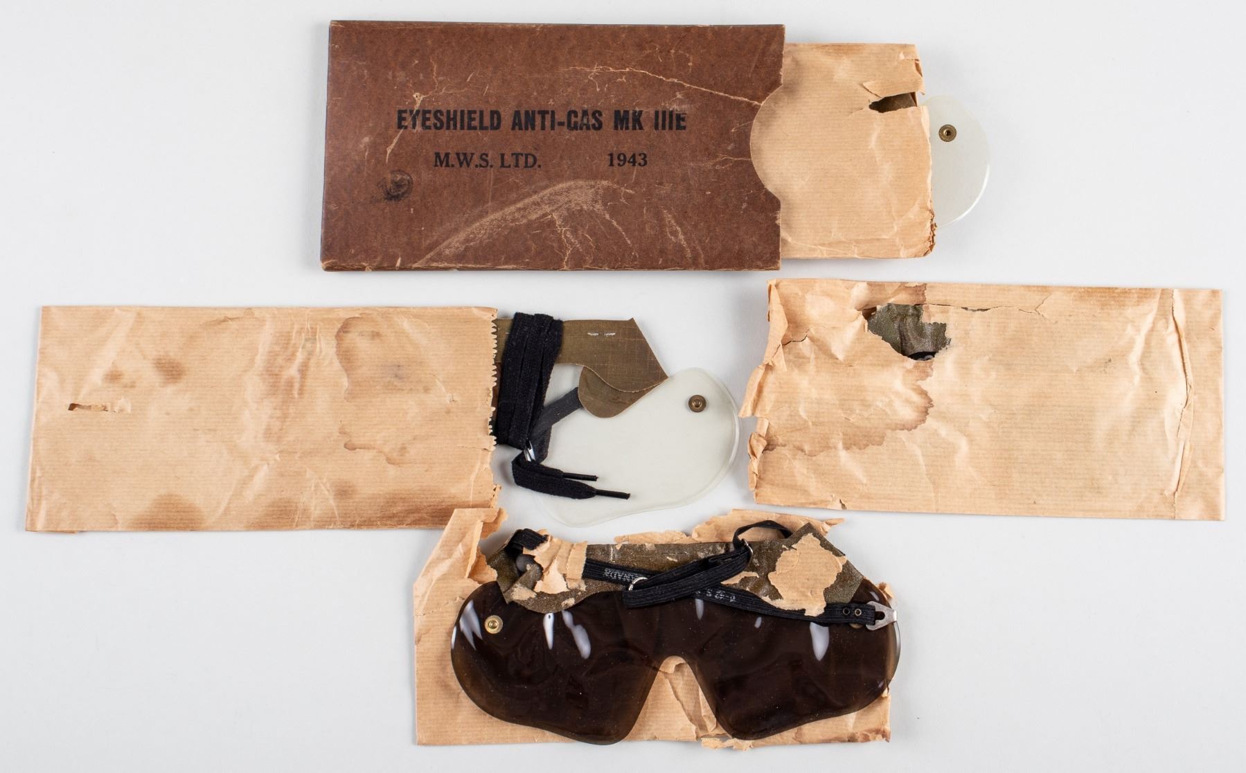 Eyeshield Anti-Gas MK IIIE' 1943. Four eyeglasses in paper packaging with either dark or clear lenses. All glasses are kept in cardboard sleeve. 8.5 x 4.5 inches.