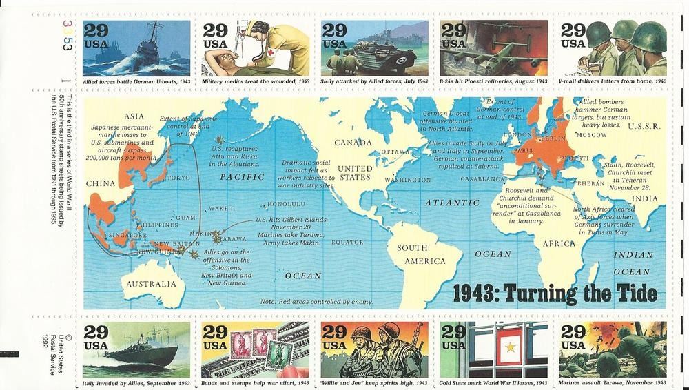 USPS 1993 WW II 1943 Turning The Tide - 20 Stamp Sheet - Scott 2765