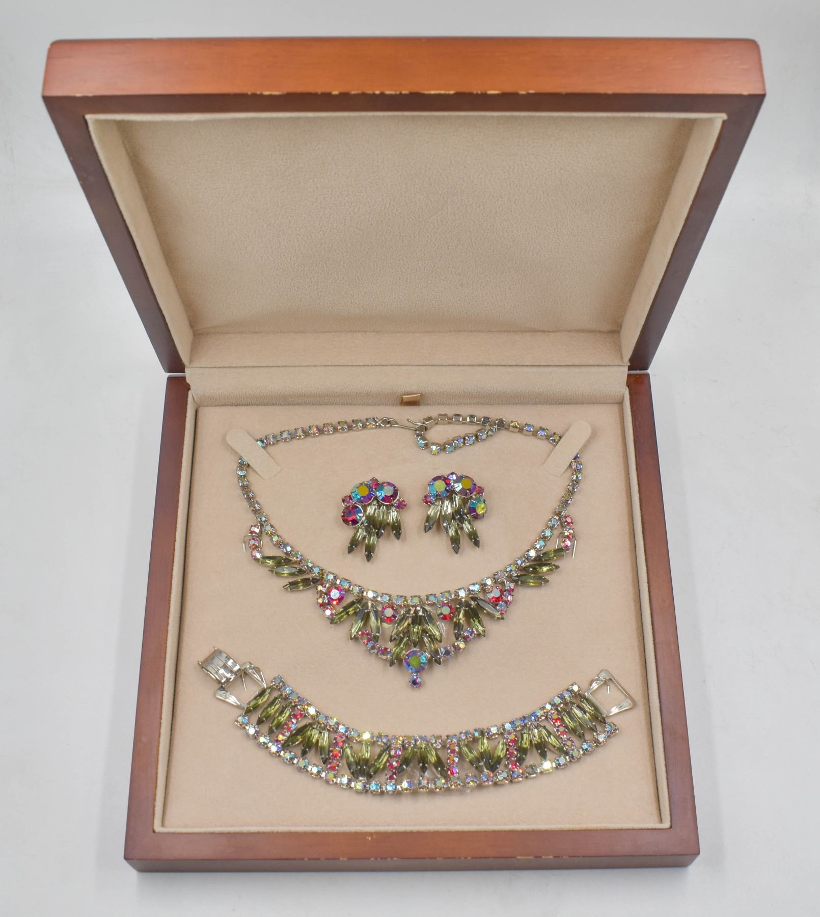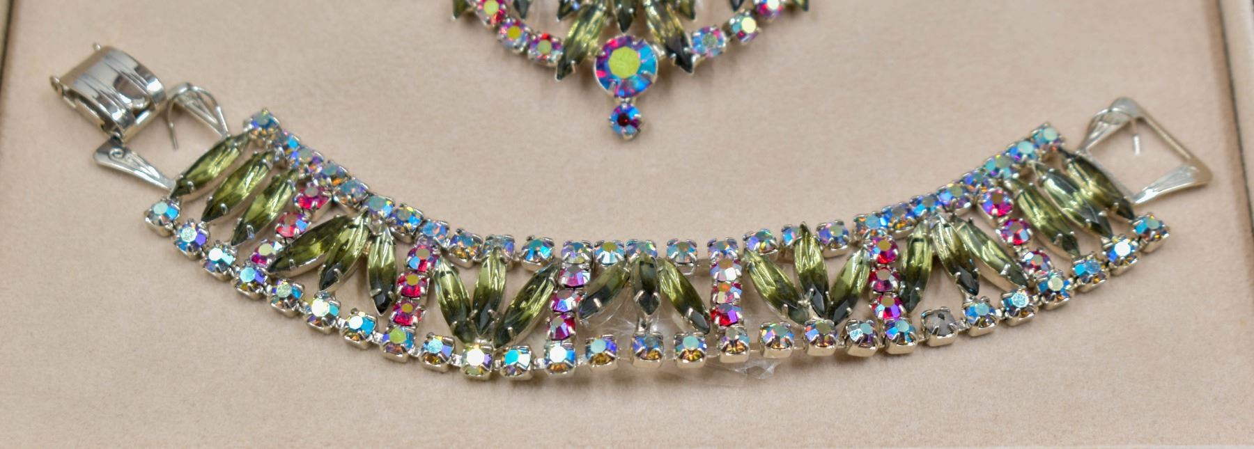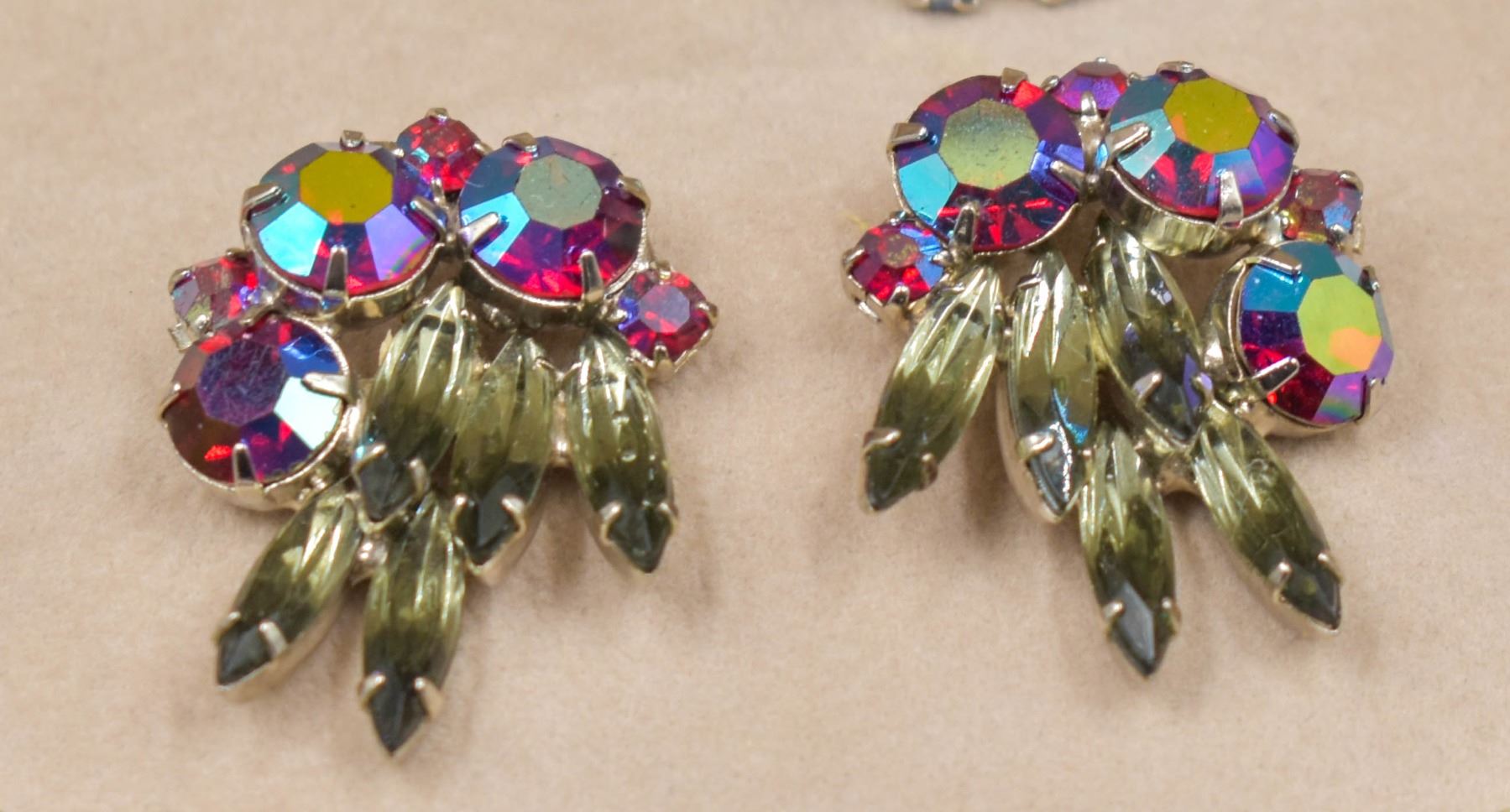- RED/PINK/BLUE (SIAM) & LIGHT MOSSY GREEN NAVETTE & ROUND RHINESTONES, NO MISSING STONES, EARRINGS ARE CLIP, IN A WOOD & VELVET JEWELRY CASE