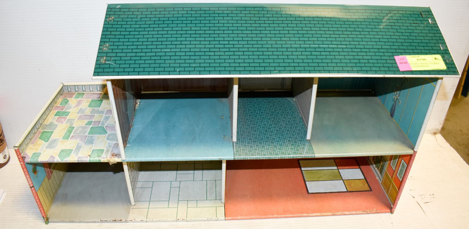 1950 TIN DOLL HOUSE 2 STORIES. FRONT DOOR MISSING