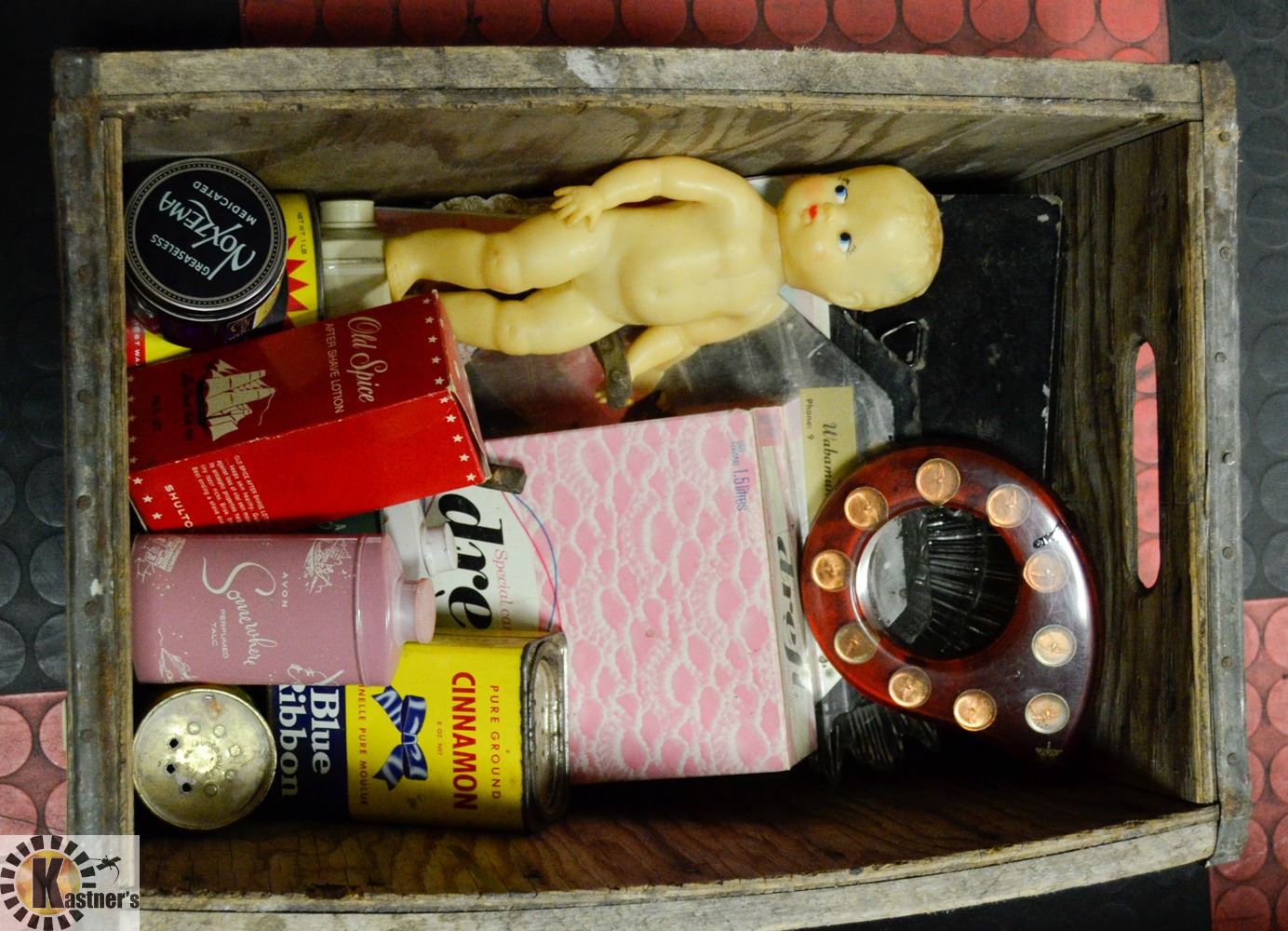 1952 SHEA'S WOOD BEER CRATE FULL OF COLLECTIBLES