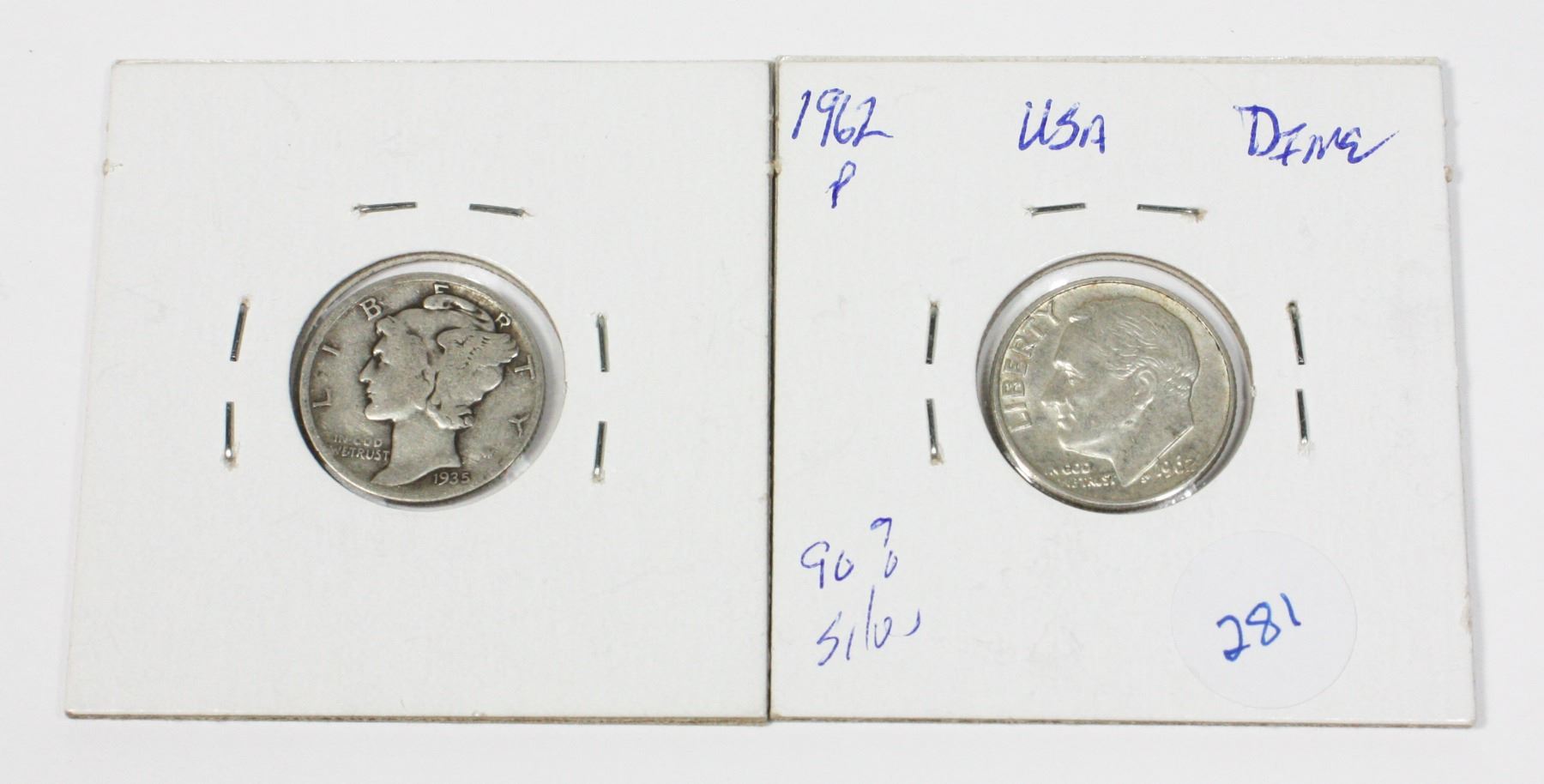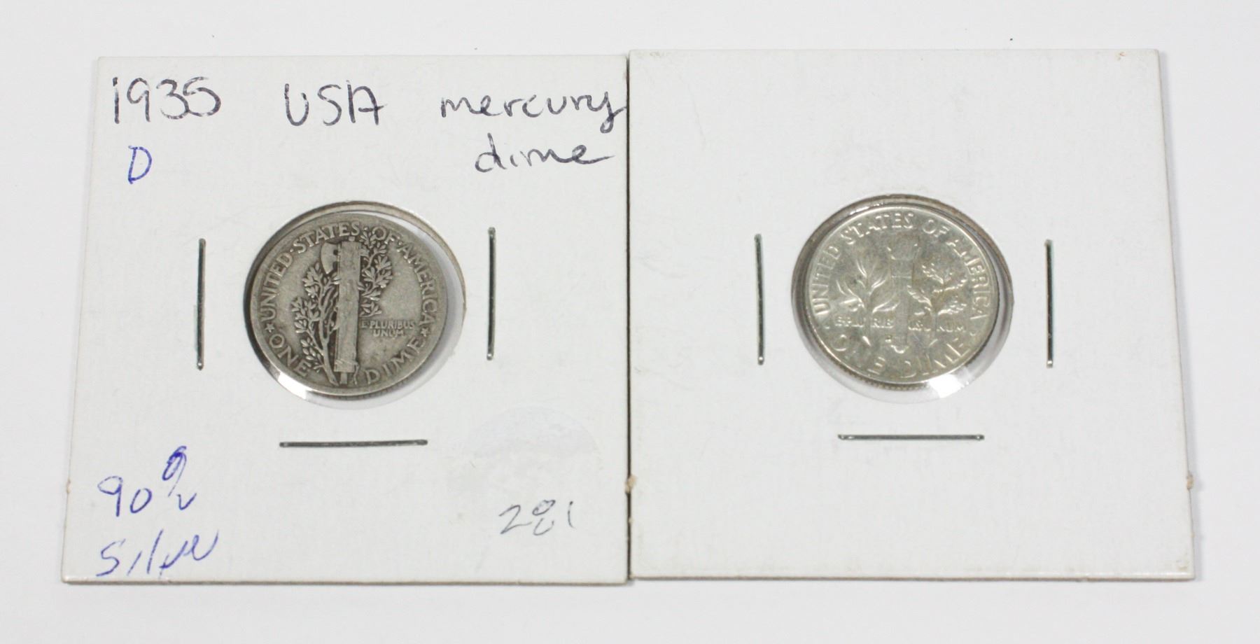 90% SILVER. 1935 D USA Mercury DIME 90% Silver 1962 USA Roosevelt Dime 90% SILVER