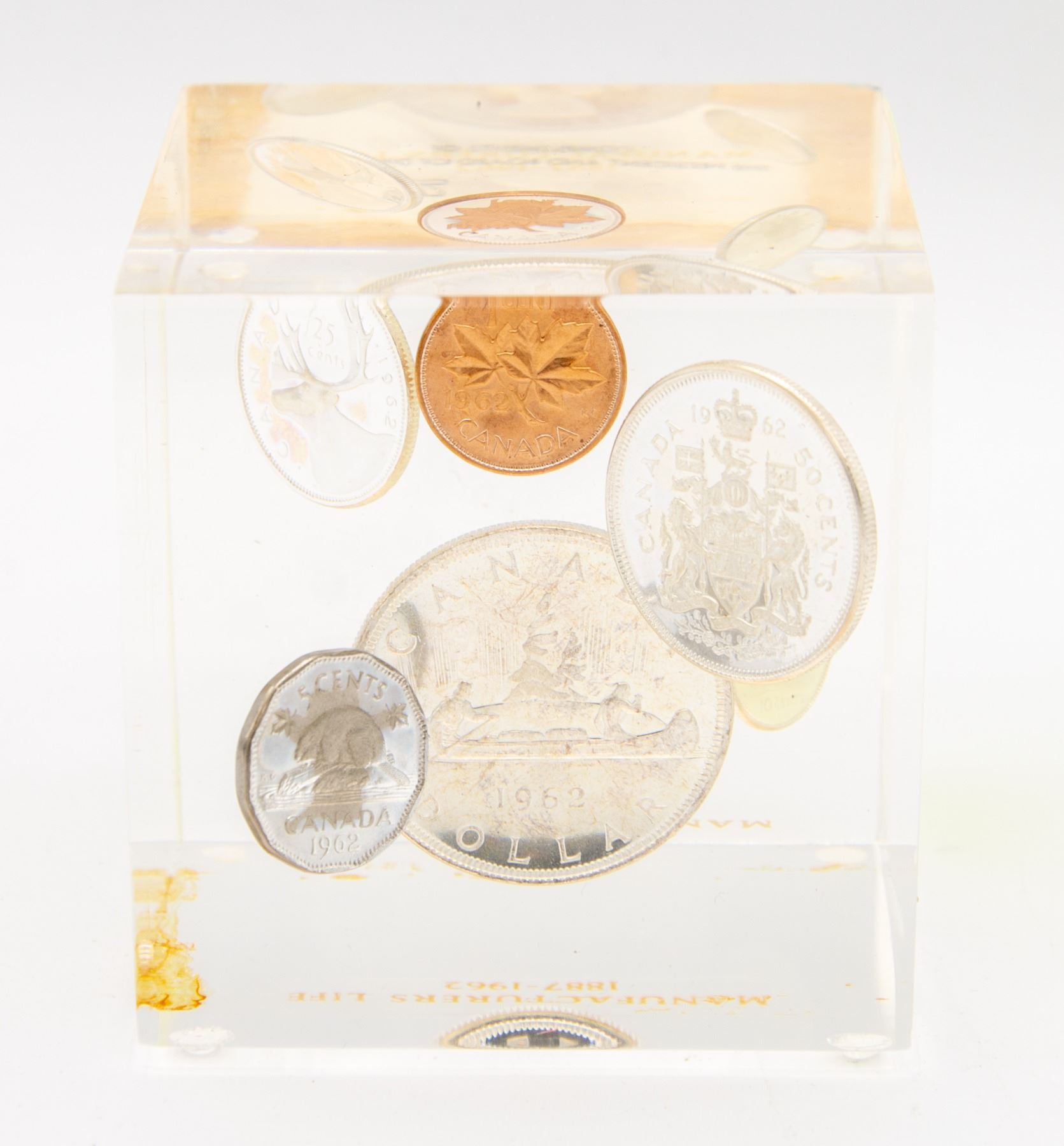 PRESENTATION PIECE FOR MANUFACTURER'S LIFE. INCLUDES SILVER DOLLAR, QUARTER, DIME, NICKEL & COPPER PENNY **ALL ITEMS MUST BE REMOVED BY 5PM MONDAY, NOVEMBER 14TH, 2022. ALL REMAINING ITEMS WILL BE SUBJECT TO A $6.00 PER DAY STORAGE CHARGE. ANY ITEMS REMAINING AFTER SUNDAY, DECEMBER 4, 2022 WILL BE CONSIDERED FORFEITED. NO REFUNDS WILL BE ISSUED FOR FORFEITED ITEMS. TO SCHEDULE A PICK UP APPOINTMENT CLICK HERE