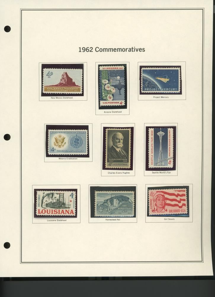 9 x 4c Stamps: New Mexico Statehood; Arizona Statehood; Project Mercury; Malaria Eradication; Charles Evans Hughes; Seattle World's Fair; Louisiana Statehood; Homestead Act; Girl Scouts