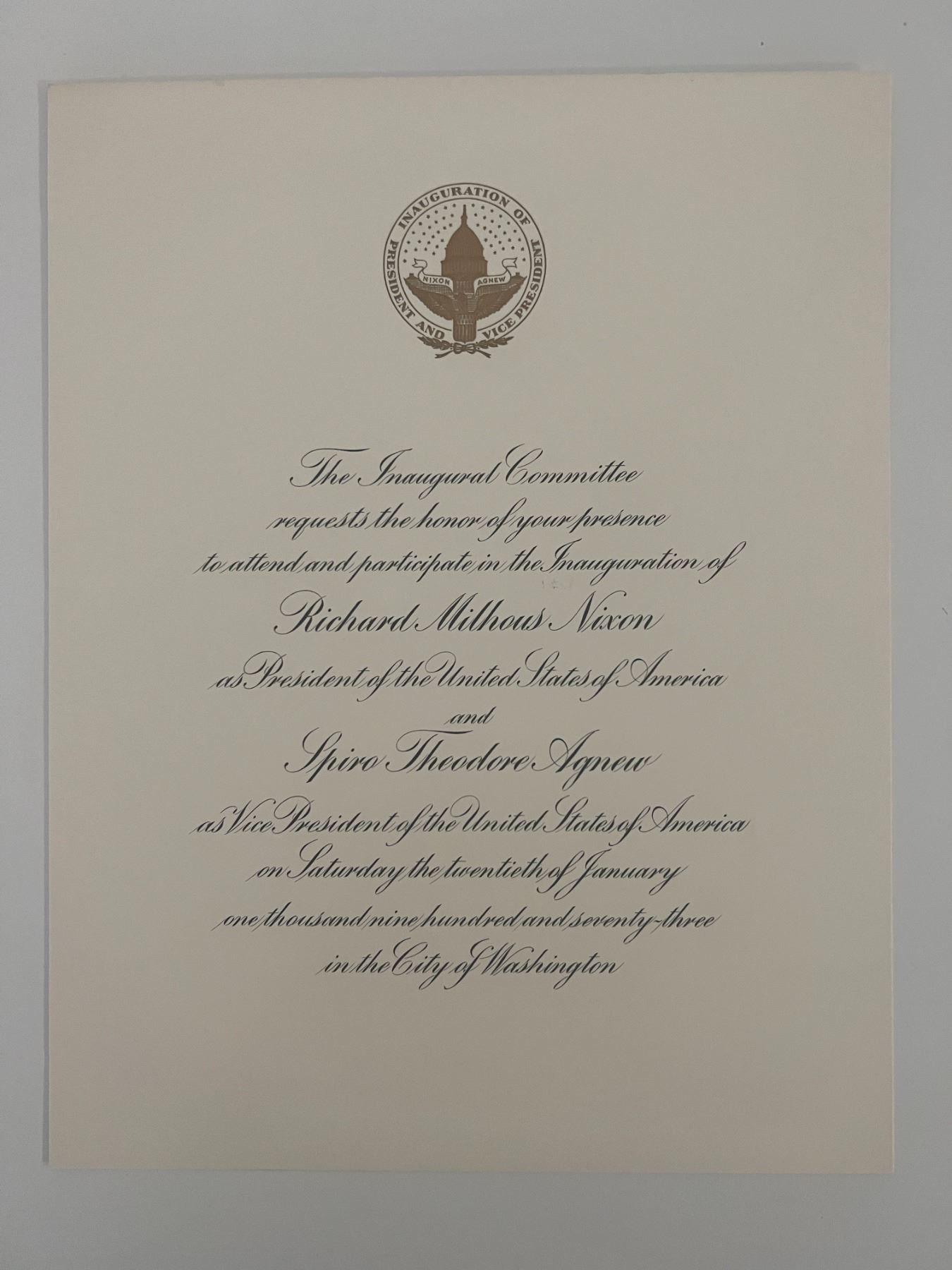 1969 Richard Nixon inauguration invitation. 8x10 inches