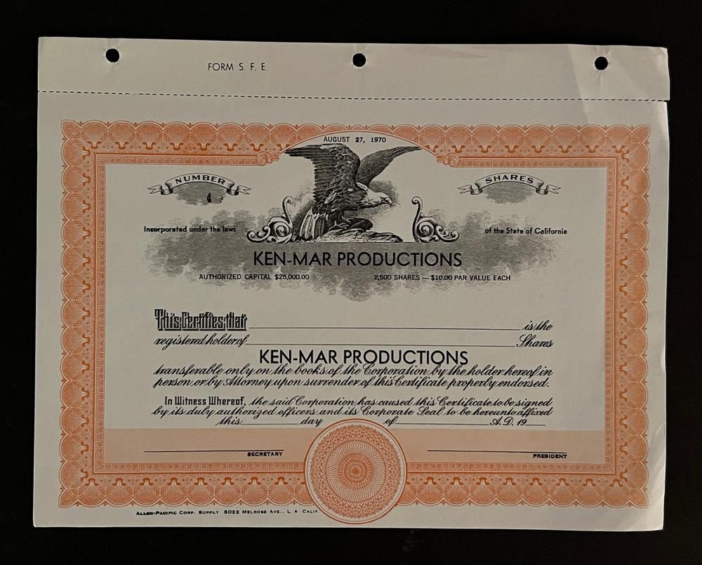 1970 Ken Mar Productions Blank Shares Certifiicate