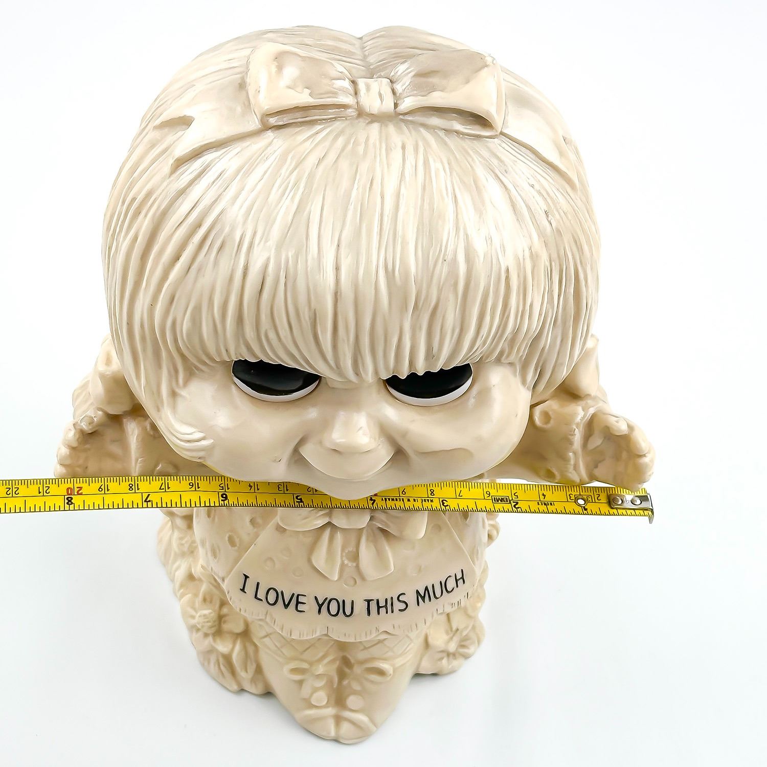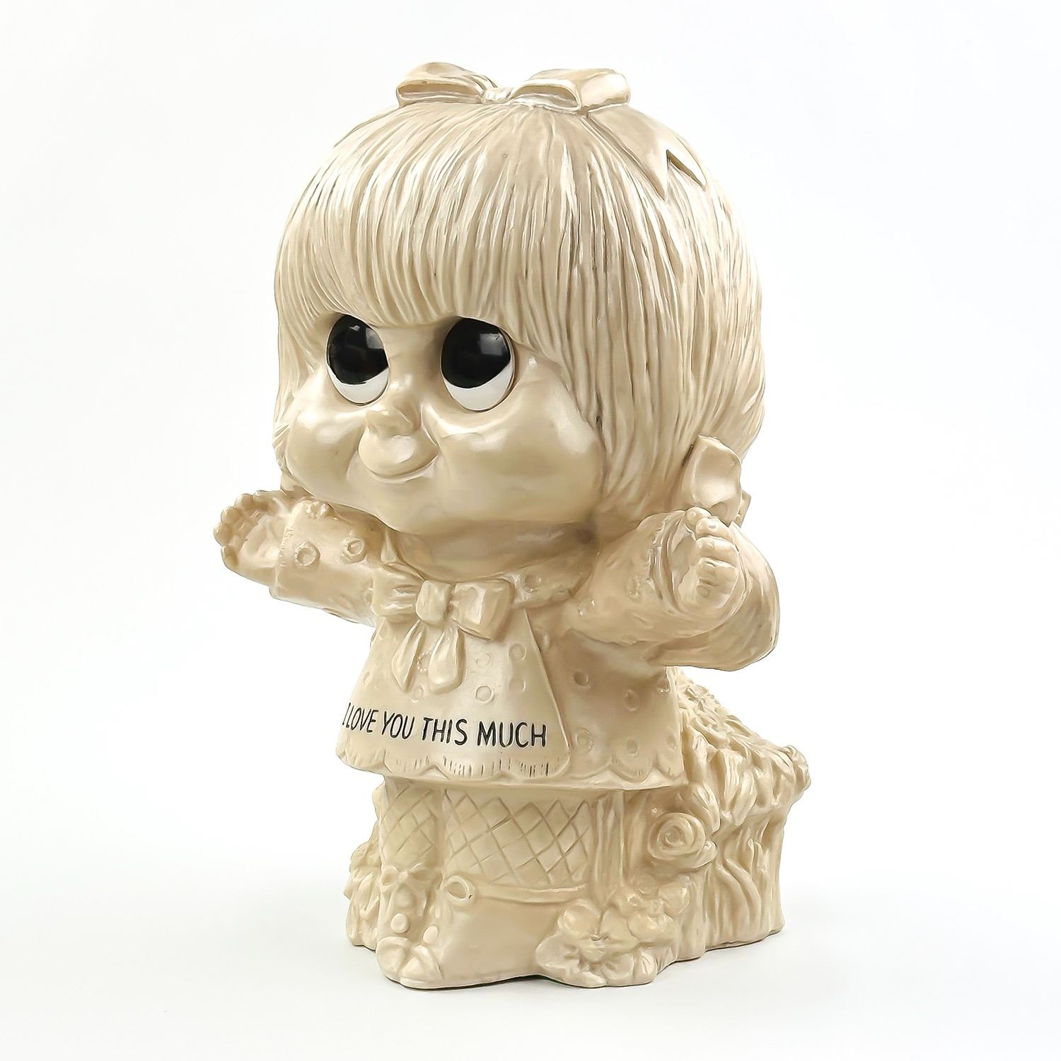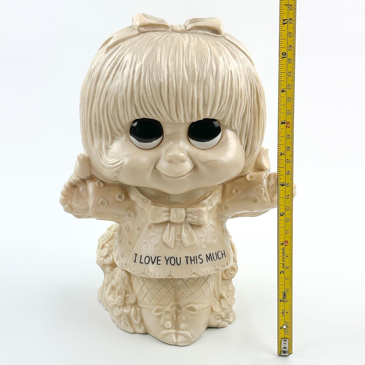 #8945 - LARGE VINTAGE 11” TALL WALLACE & RUSS BERRY GIRL STATUE SCULPTURE - I LOVE YOU THIS MUCH - COPYRIGHT 1972. MADE OF HOLLOW PLASTIC - HOME, BEDROOM OR OFFICE DECOR. MEASURES: 11” (28 CM) TALL BY 8” (20 CM) WIDE AND 5.5” (14 CM) DEEP