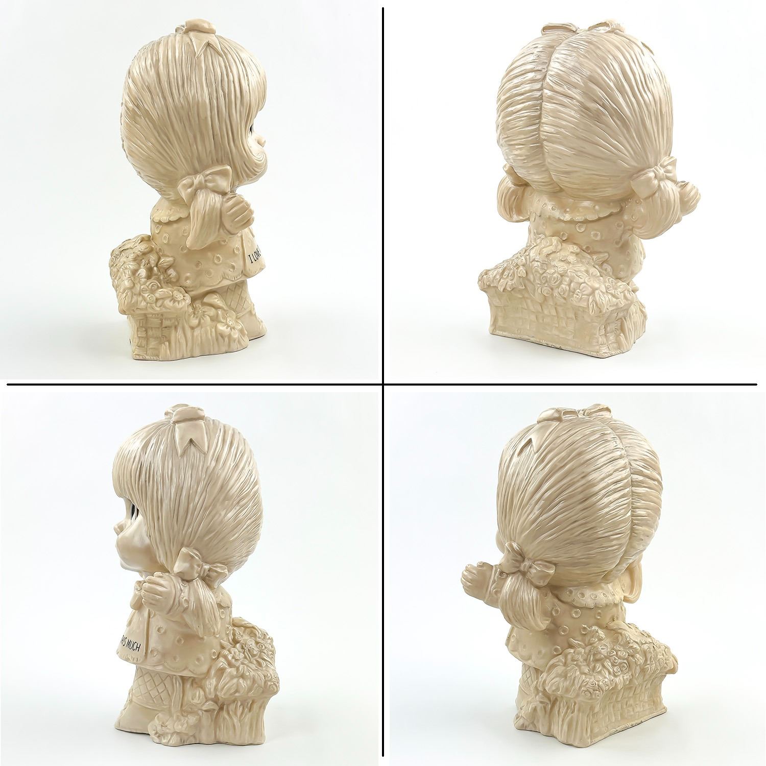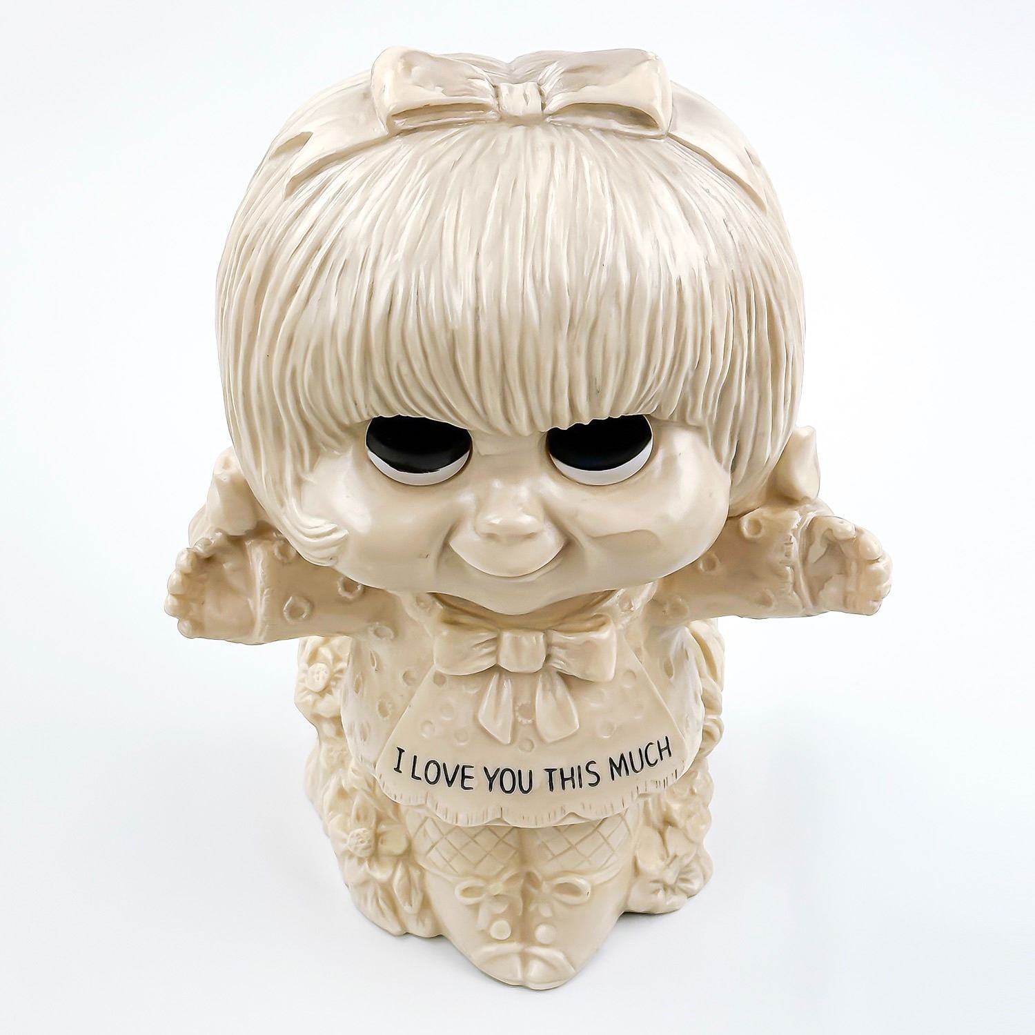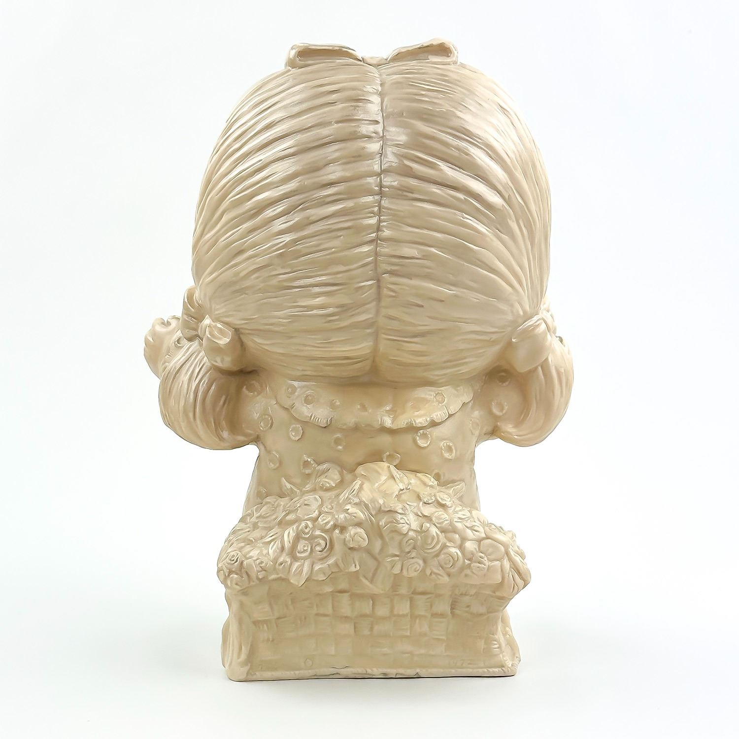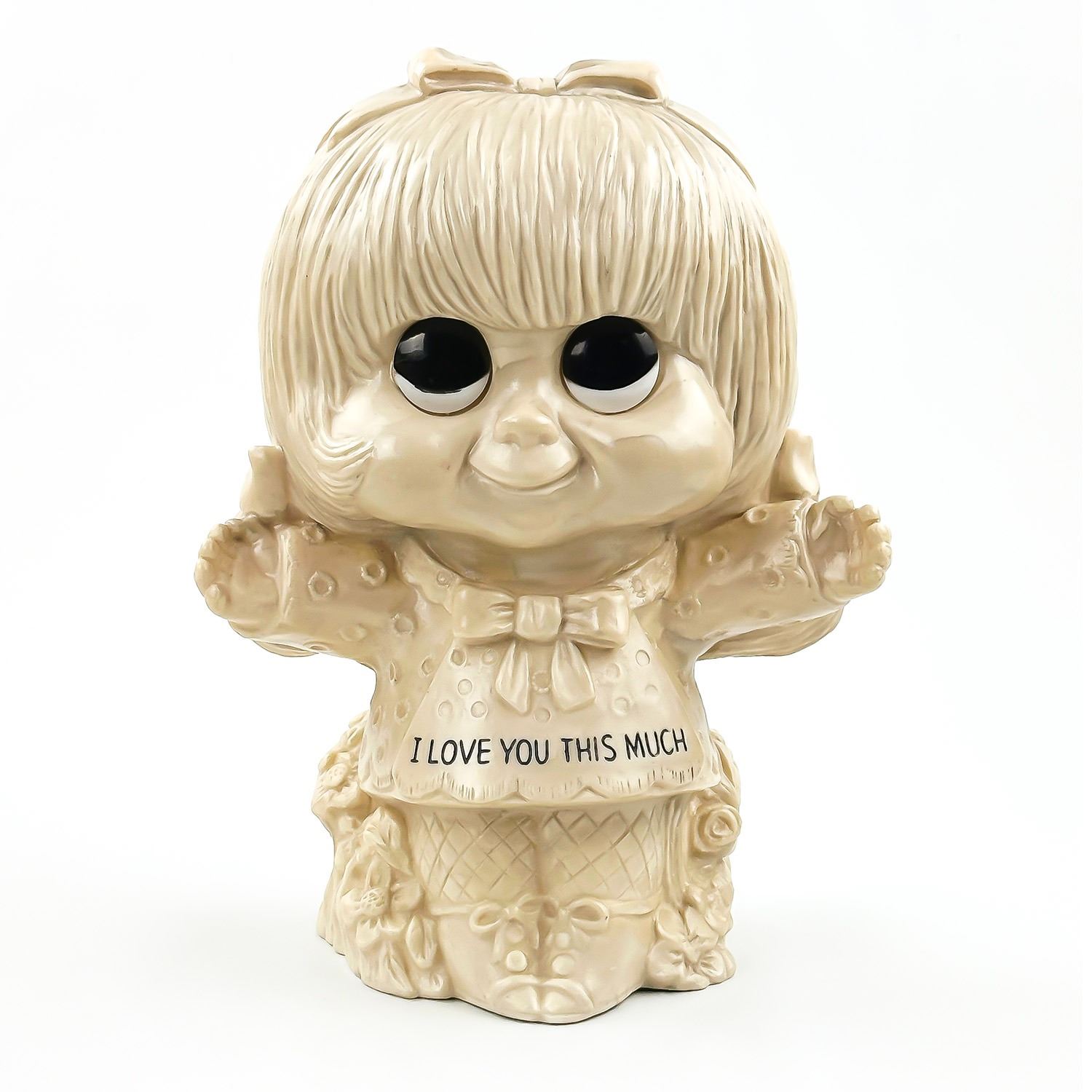 #8945 - LARGE VINTAGE 11” TALL WALLACE & RUSS BERRY GIRL STATUE SCULPTURE - I LOVE YOU THIS MUCH - COPYRIGHT 1972. MADE OF HOLLOW PLASTIC - HOME, BEDROOM OR OFFICE DECOR. MEASURES: 11” (28 CM) TALL BY 8” (20 CM) WIDE AND 5.5” (14 CM) DEEP
