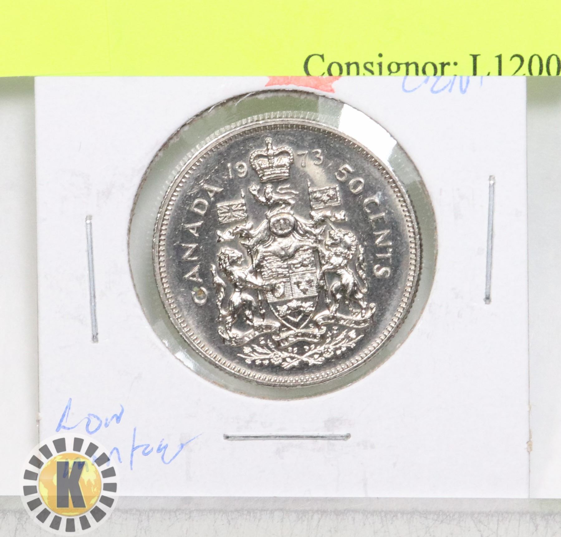 VERY LOW MINTAGE 50 CENTS 1973: 2,546,096. FIFTY CENT PIECES FROM 1987 TO DATE HAVEN'T ENTERED CIRCULATION IN ANY GREAT NUMBERS DUE TO HOARDING BY INVESTORS AND THE PUBLIC.***ITEM(S) LOCATED IN LETHBRIDGE ALBERTA