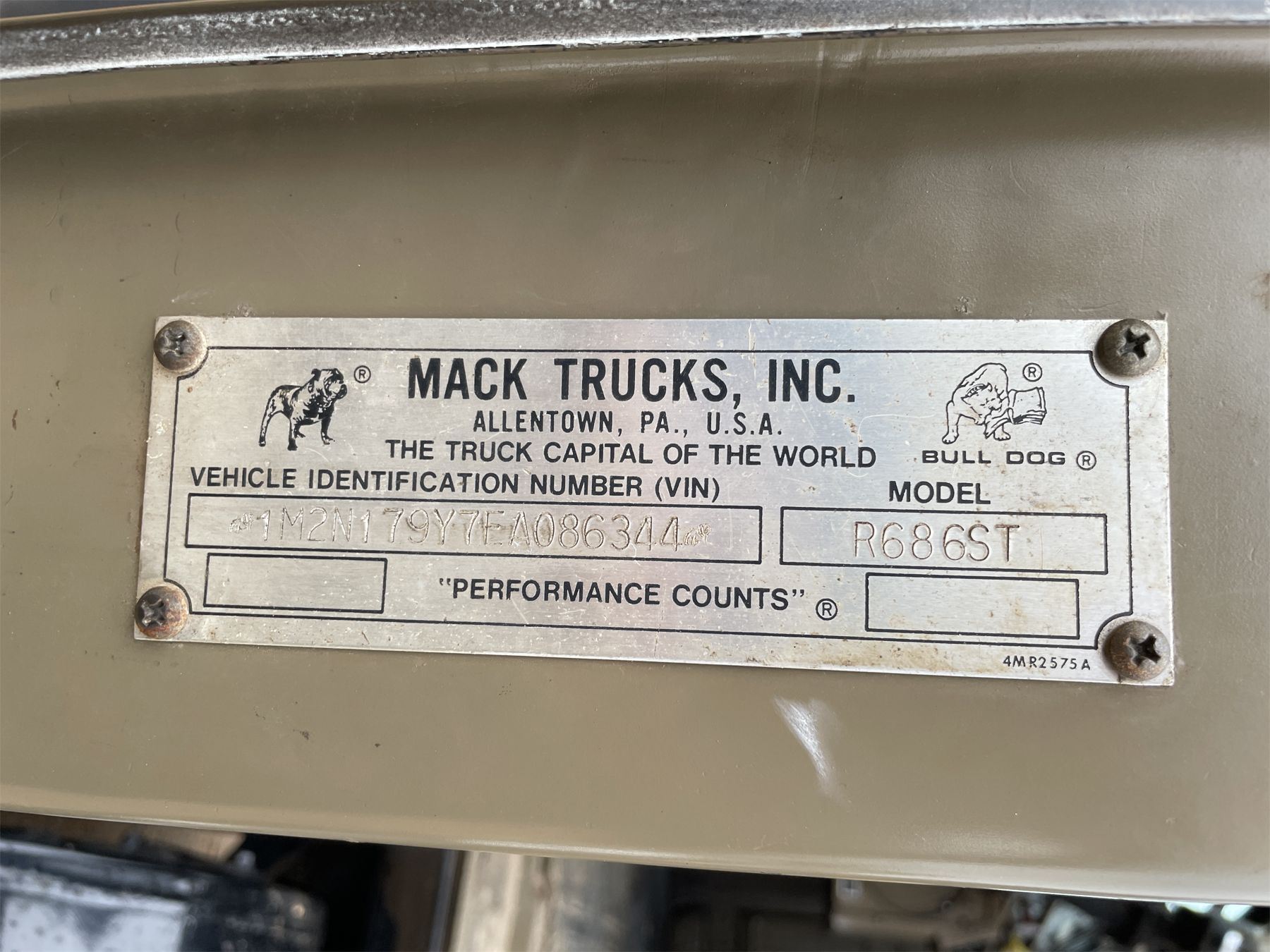 T/A, Mack engine, 6 speed dual trans, 44K rears, 12K front, 270" W/B, wet kit, 10.00R20 tires, ONE OWNER, ORIGINAL MILES