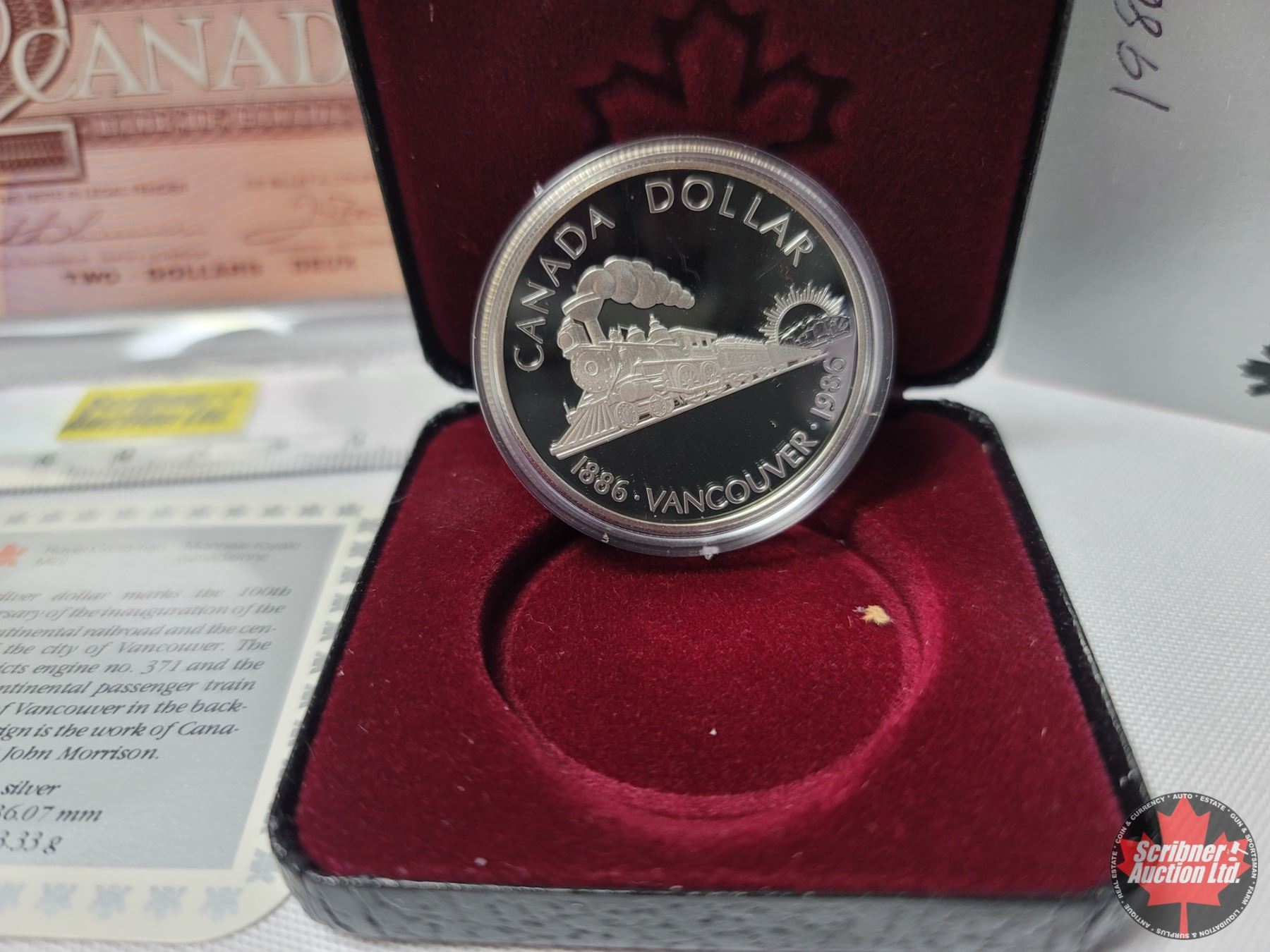 1986 Collector Combo: RCM Canada Silver Dollar 1886-1986 Vancouver in Black Case + 1986 $2 Bill (See Pics for Serial Numbers & Signatures)