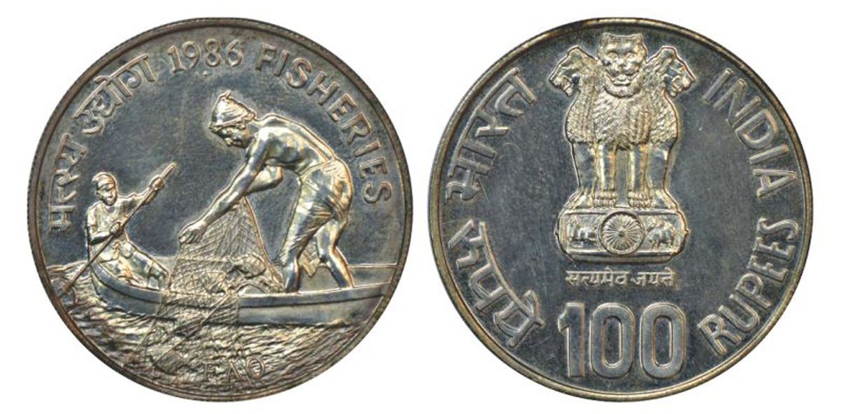 1986, Fisheries, silver 100 rupees (50% silver), 35.25g, Bombay mint, KM 283.