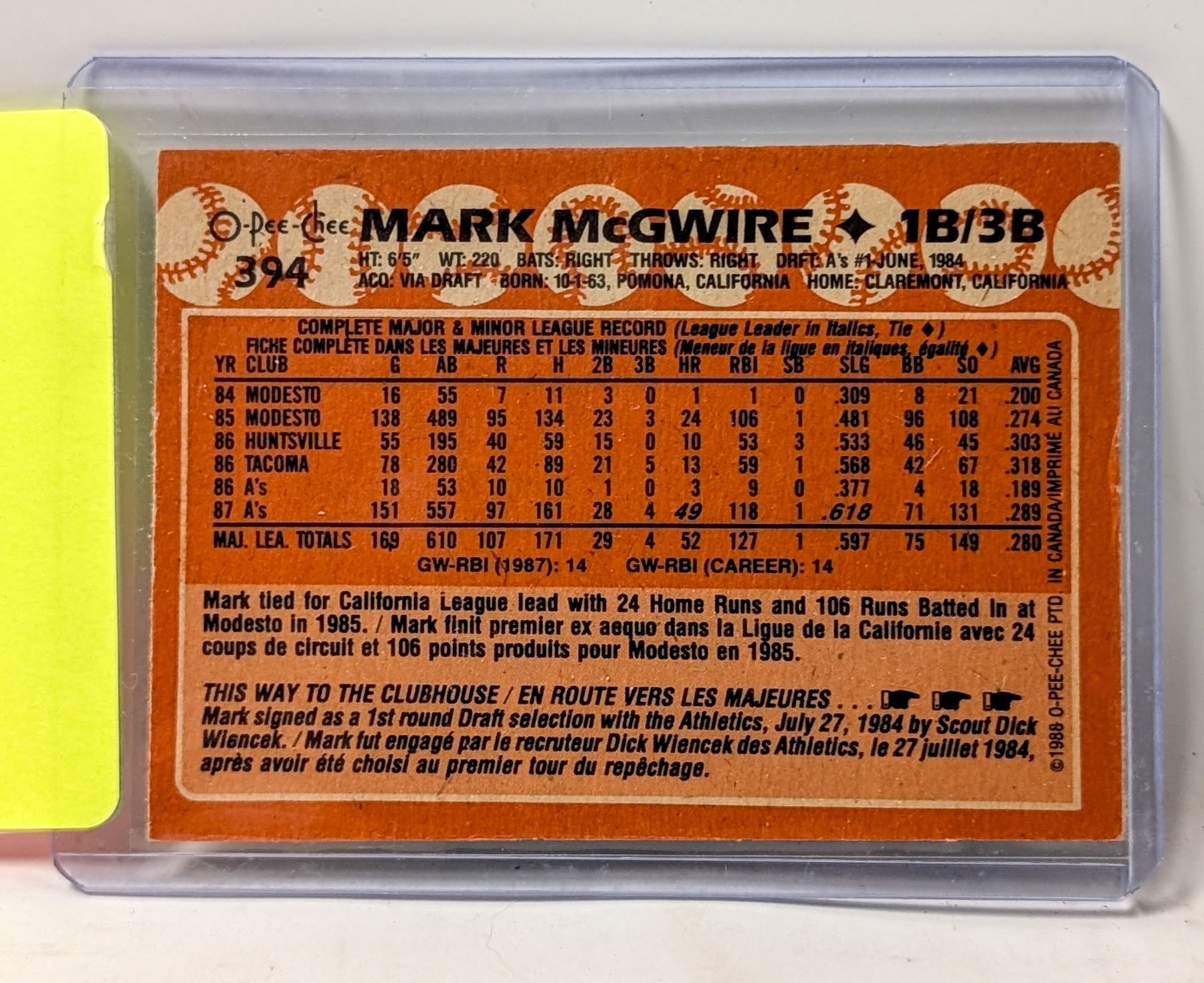 1987 OPC MARK MCGUIRE ROOKIE CARD EXC