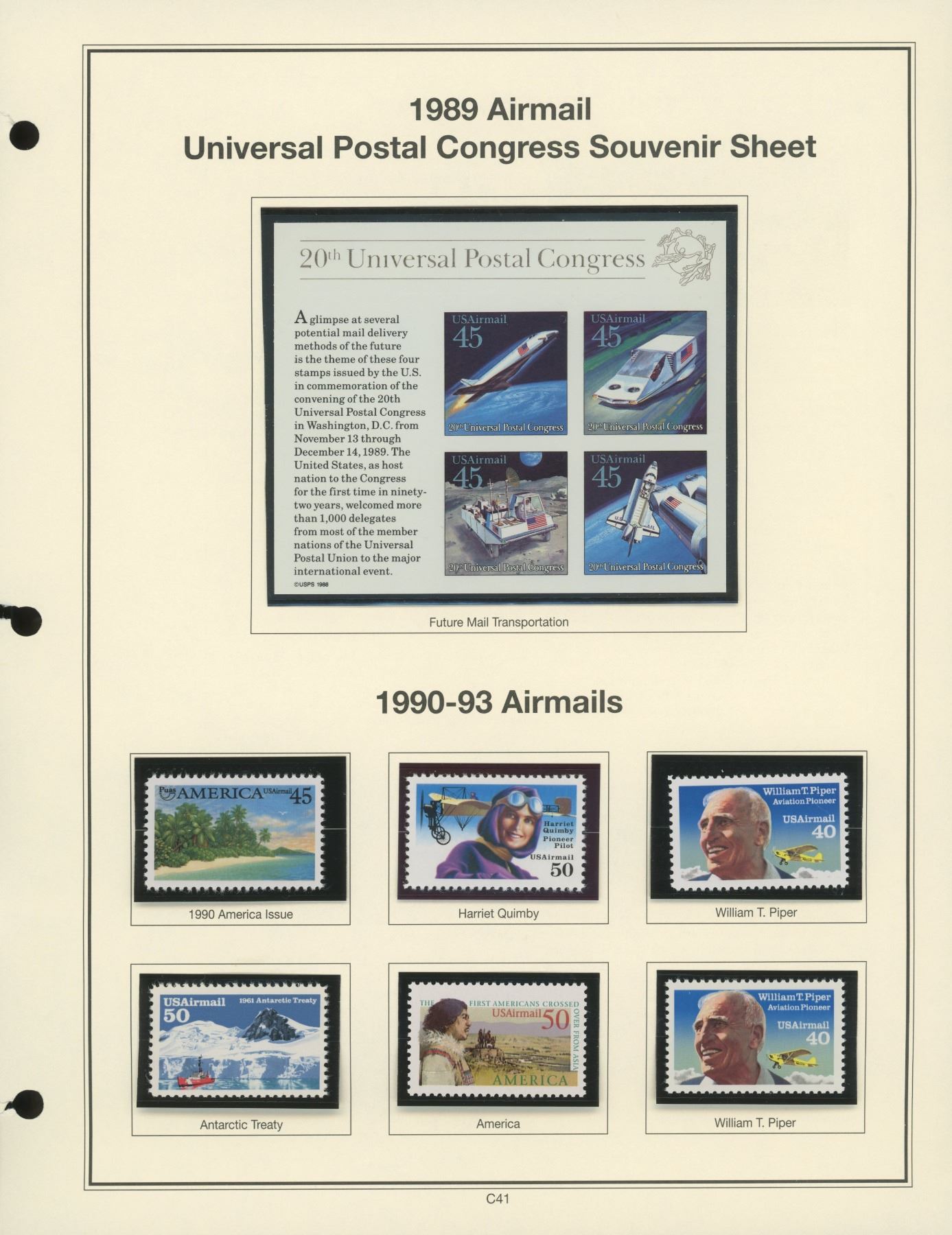 1989 Airmail Universal Postal Congress Souvenir Stamp Sheet & 1990-93 Airmails: 1990 America Issue; Harriet Quimby; William T. Piper; Antarctic Treaty; America.