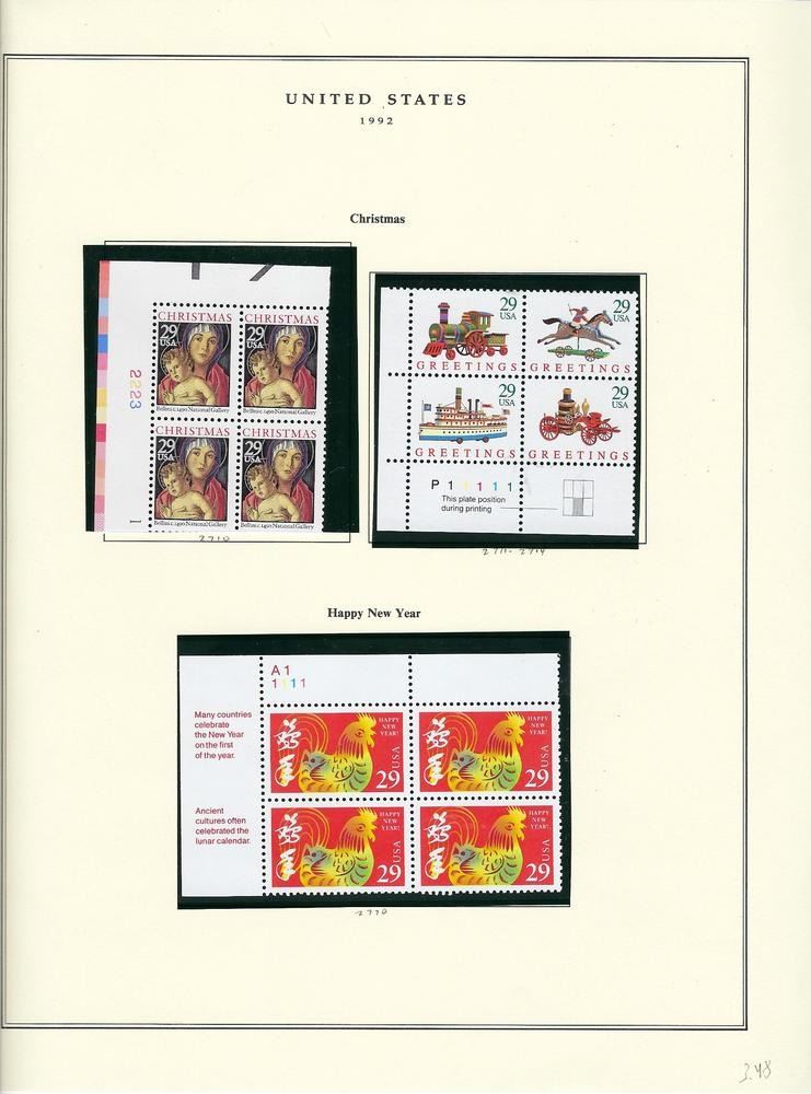 1992 US stamp collector sheet featuring Christmas and New Year's stamps