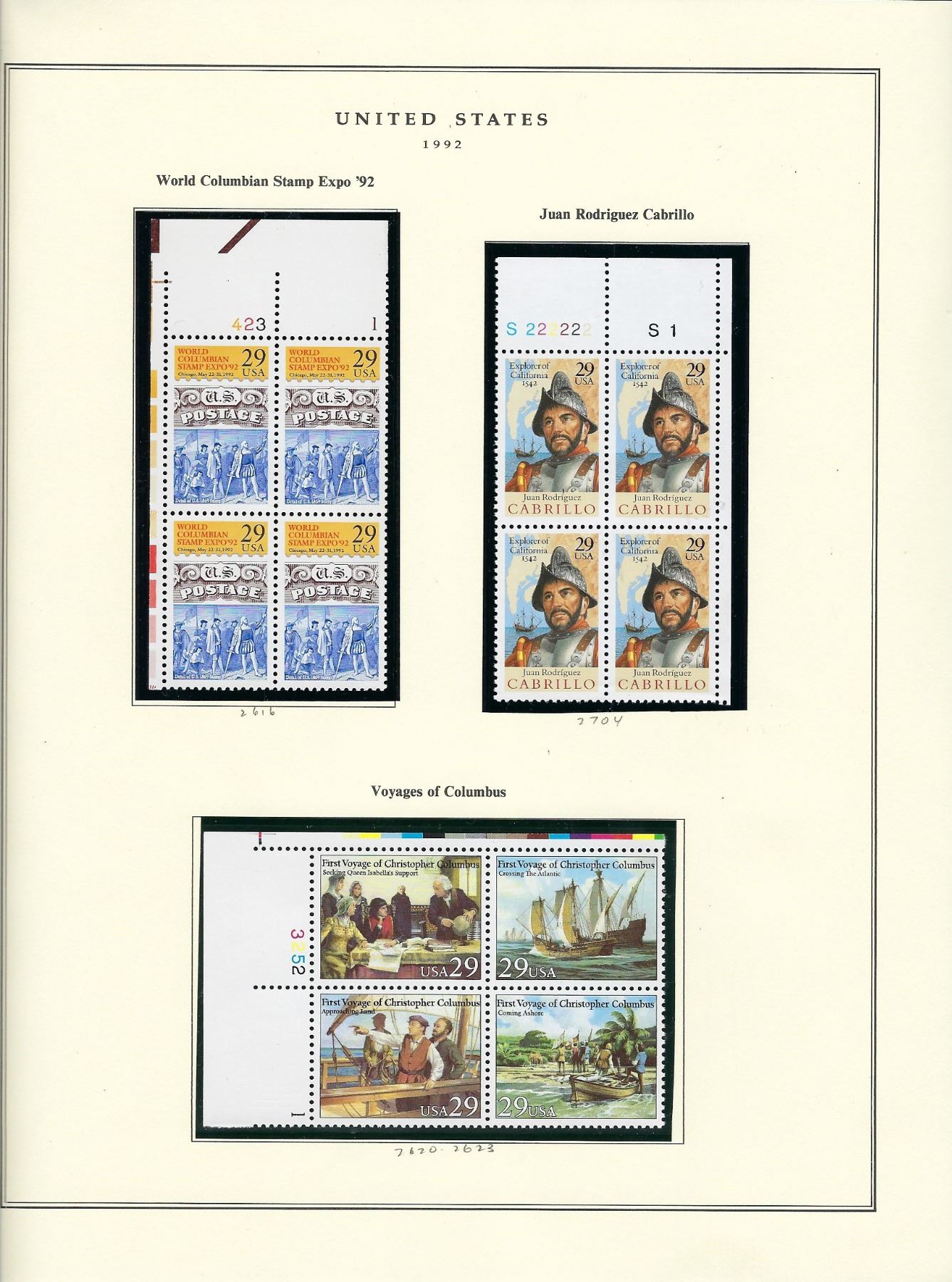 1992 US stamp collector sheet featuring World Columbia Stamp Expo 82, Voyage of Columbus and Juan Rodriguez Cabrillo stamps