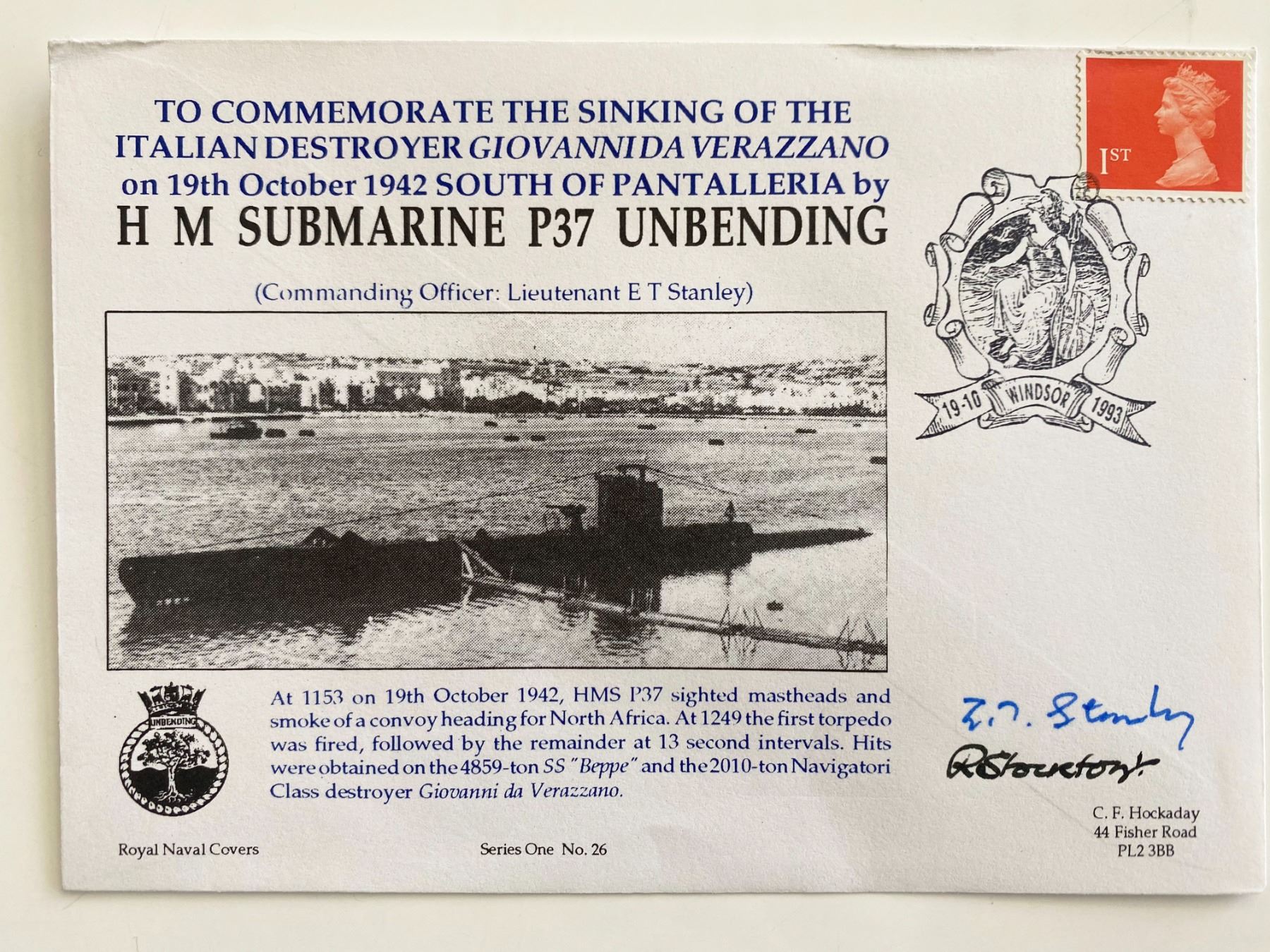 Sinking Italian Ship by HM Submarine P37 Unbending Signed Navy Commemorative Cover Autographed by Cdr E Stanley and Leading telegraphist J Stockton - Windsor 1993. 5x7 inches