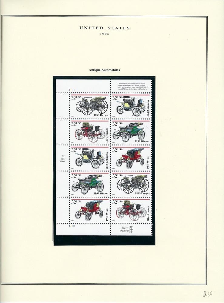 1995 US stamp collector sheet featuring Antique Automobiles stamps