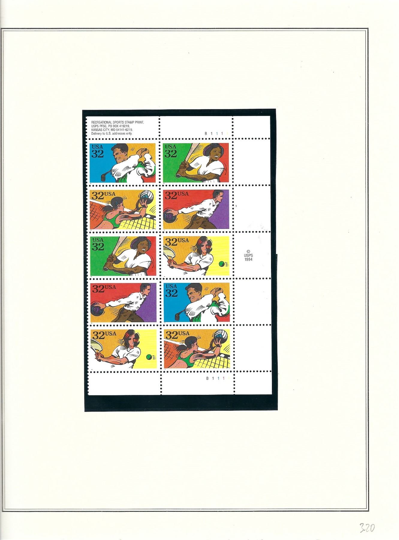 1995 US stamp collector sheet featuring Recreational Sports stamps
