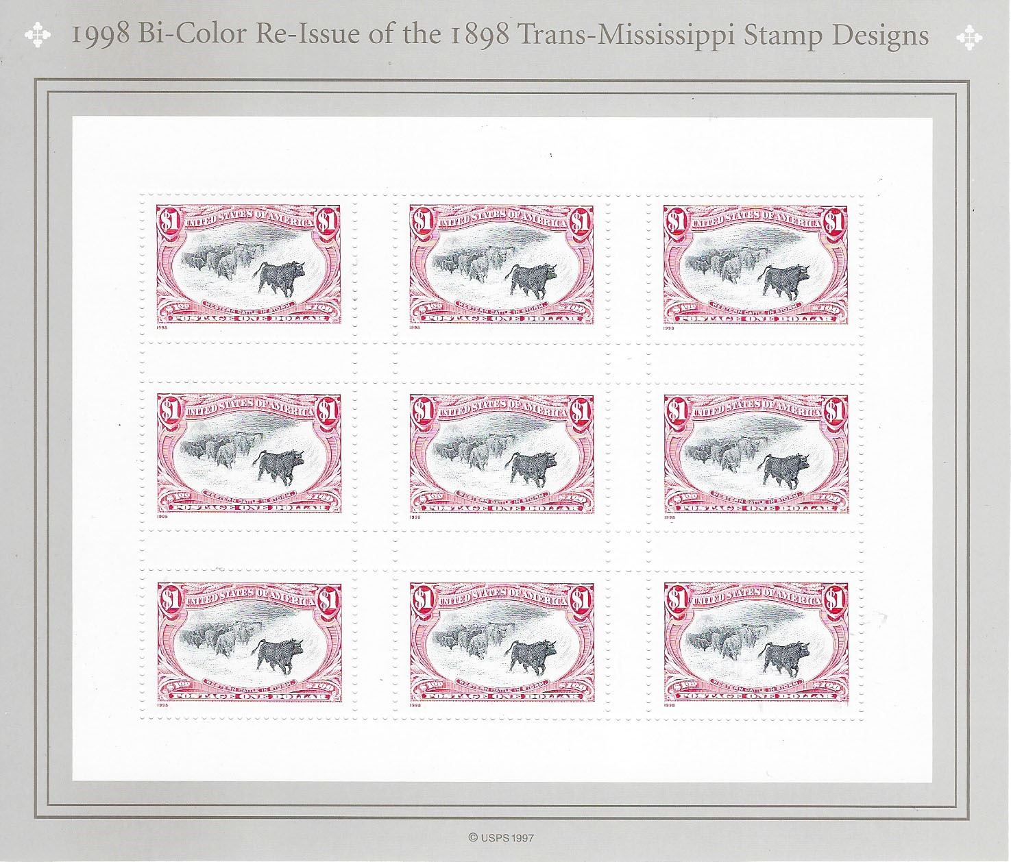 1998 Bi-Color Re-Issue of 1898 Trans-Mississippi stamp design sheet