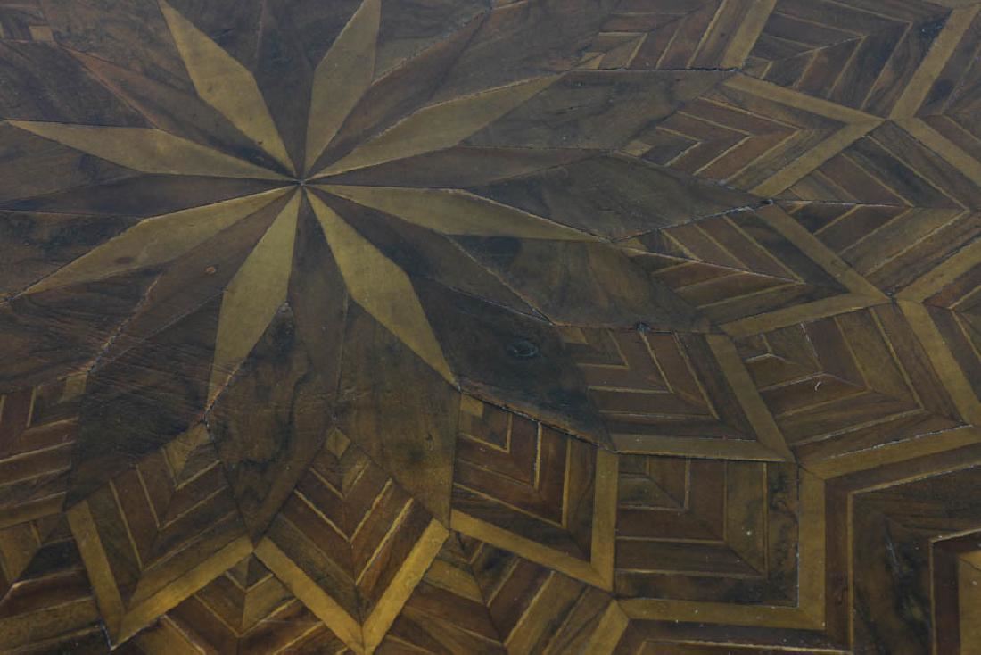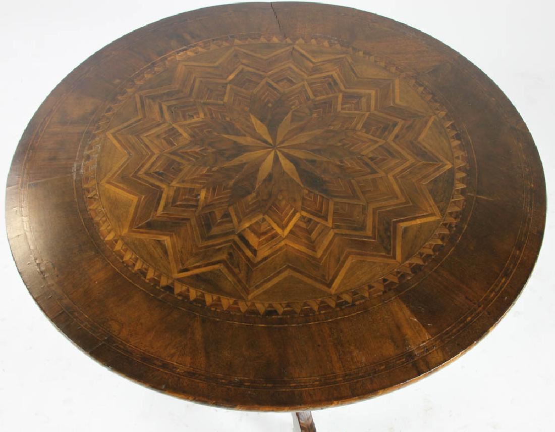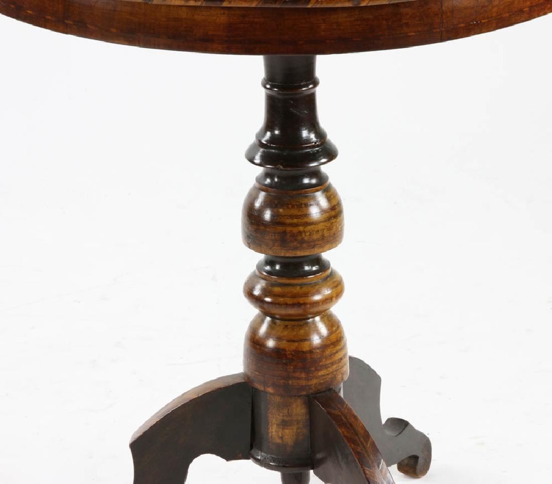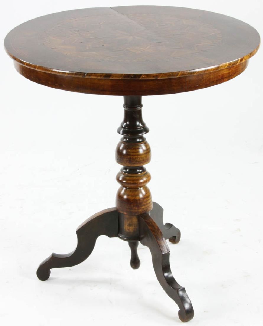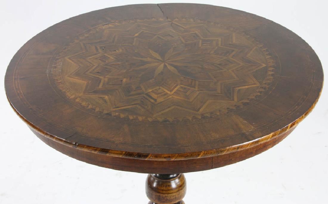 19th century circular table with marquetry inlaid top, 29 3/4" H x 27 3/4" diameter. Provenance: Vero Beach, Florida estate.