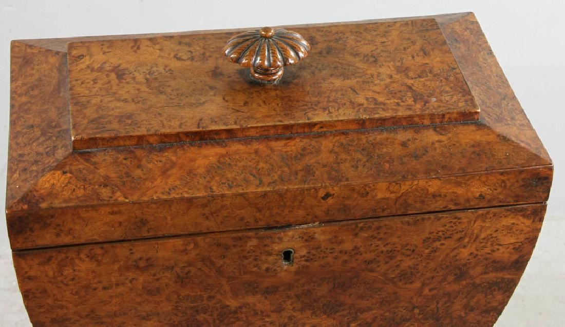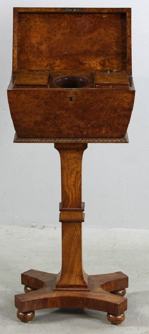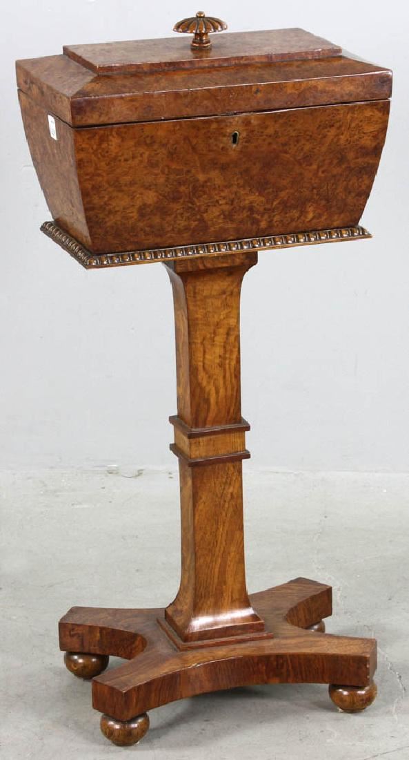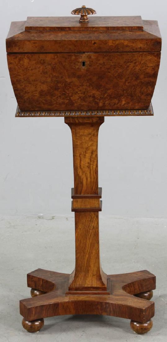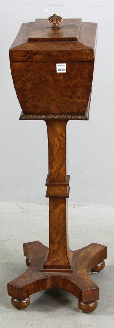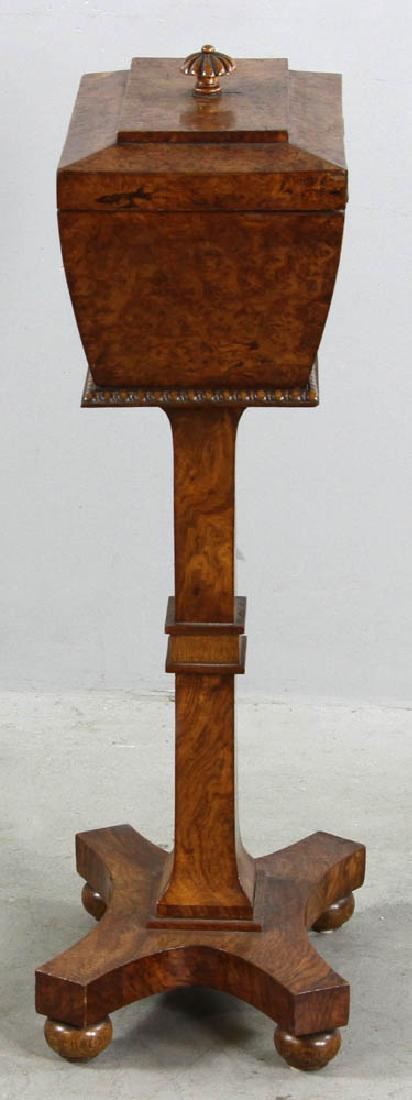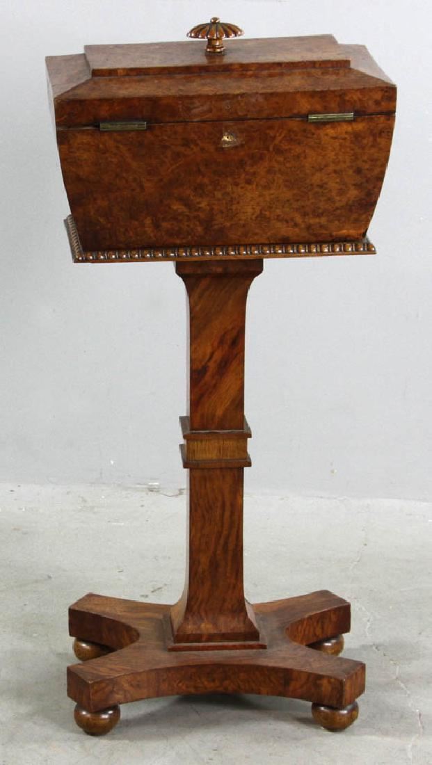 19th century Regency burlwood teapoy, 34" H x 15" W x 9" D. Provenance: Wakefield, Massachusetts estate.
