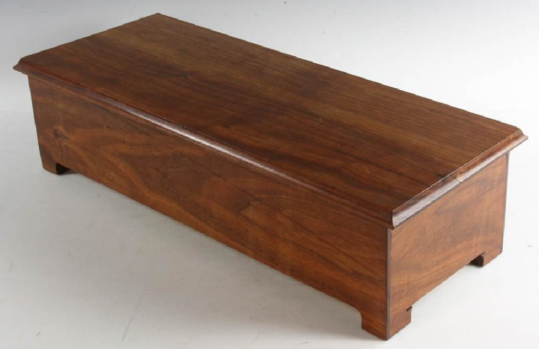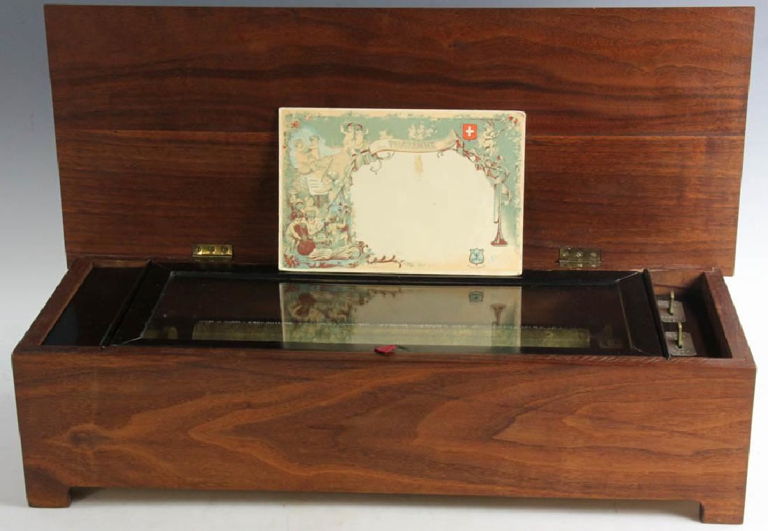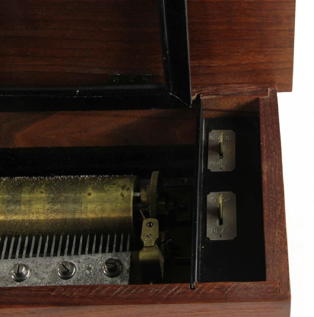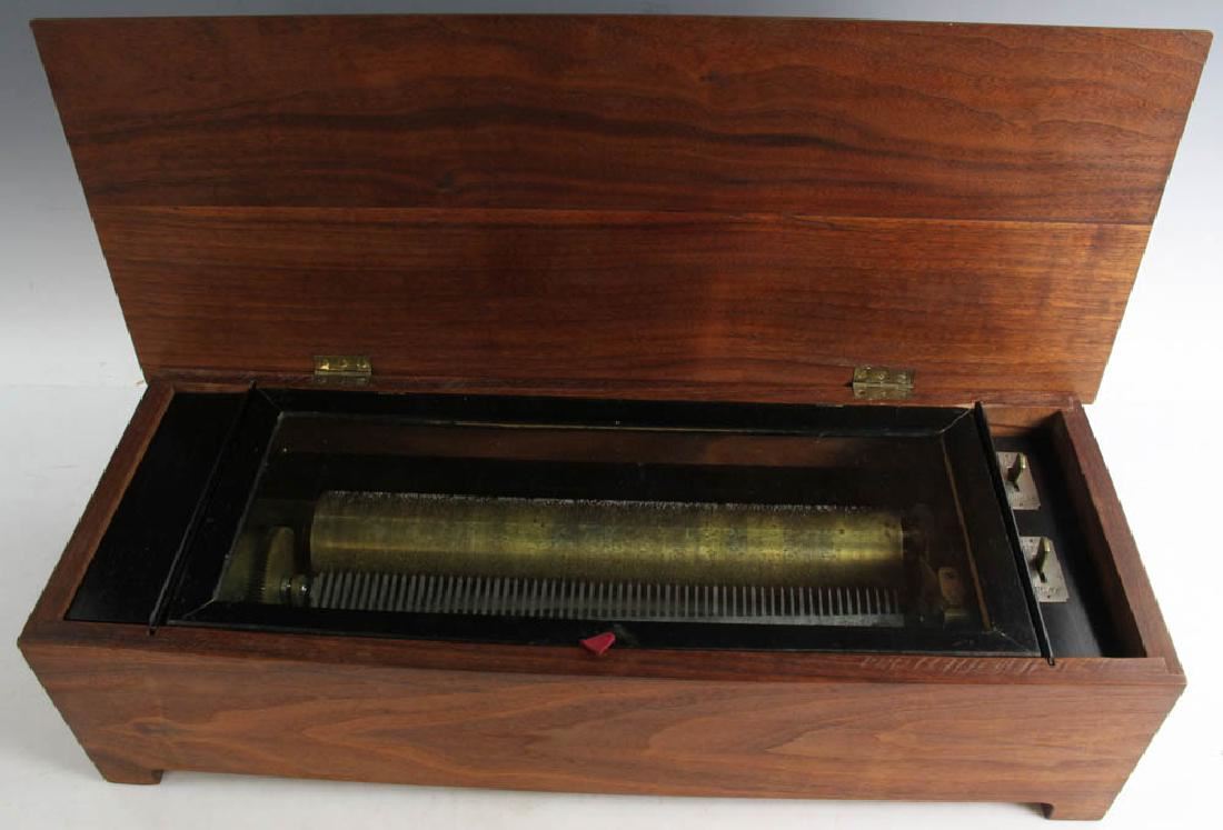 19th century cylinder music box in newer case, operating condition, case measures 6" H x 23 1/4" w x 9" D. Provenance: Gretna, Louisiana estate.
