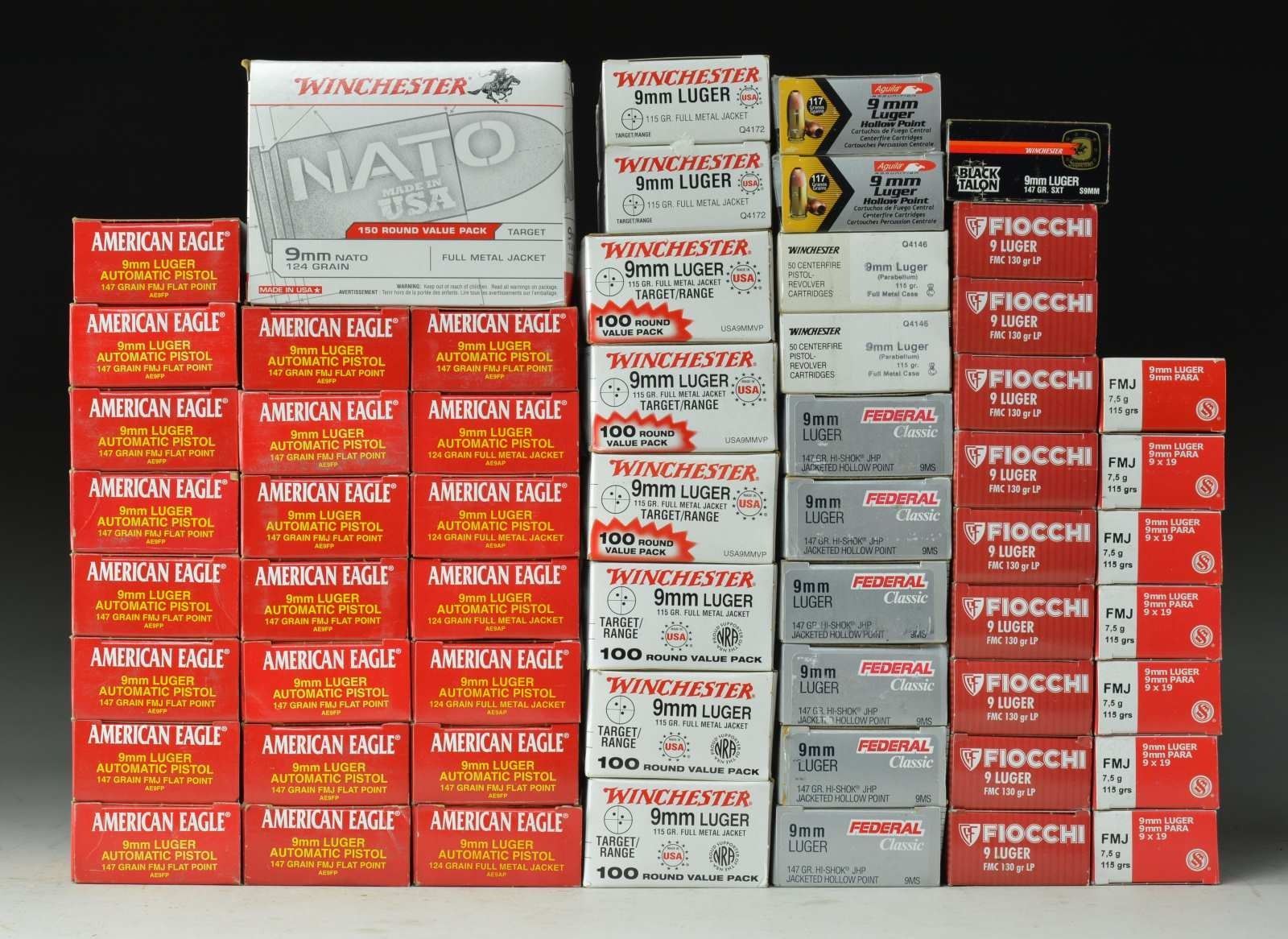 FMJ / FMC: 800 RDS. (10 BOXES) of Win. 115 gr. / 150 RDS (1 BOX) of Win. 124 gr. / 850 RDS. (17 BOXES) Of American Eagle 147 gr. flat point. / 250 RDS. (5 BOXES) Of American Eagle 124 gr. / 350 RDS. (7 BOXES) of Sellier & Bellot 115 gr. / (9 BOXES) of Fiocchi 130 gr. LP.