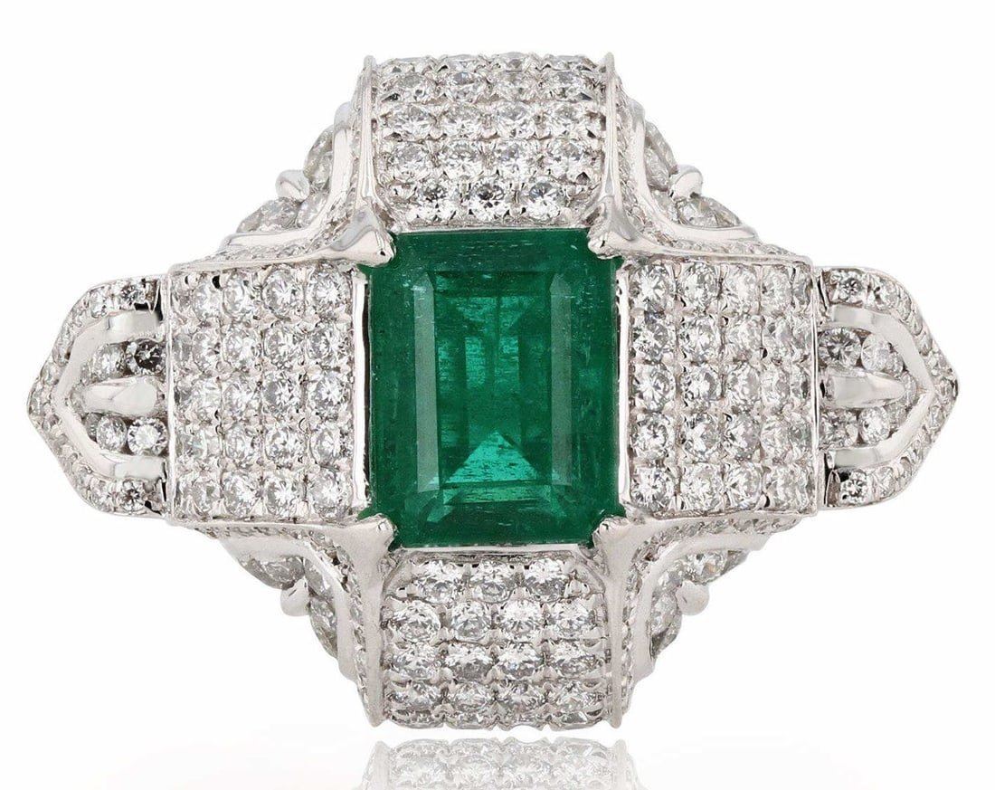 Platinum Emerald & Diamond Ring One polished, stamped, and tested platinum ring with a bright finish. The ring is mounted with: 1 genuine emerald center stone weighing approximately 2.87 carat, and 248 genuineround diamonds weighing approximately 2.12 carats. This item weighs 17.1 grams, condi-tion is new, excellent workmanship. MAIN GEMSTONE Species: Natural Beryl Variety: Emerald Shape: Rectangular Cut CorneredCutting Style: Step Cut Measurements: 9.4 x 7.4mm Weight: 2.87 carat Color: Green Cut Grade: Very Good Refractive Index: 1.564 - 1.595 DR Birefringence: 0.005 to 0.009 Hardness: 7.5 - 8 ADJACENT GEMSTONES ON RINGIdentity: Natural Diamond Shape: Round Cutting Style: Brilliant Cut Quantity: 248 Diamonds Measurements: 0.9 - 2.0mm Total Weight. 2.12 carats Color Grade: G - H Clarity Grade: VS2 to SI2 Refractive Index:2.418 Hardness: 10 EMERALD WEIGHT: 2.87ct TOTAL DIAMOND WEIGHT: 2.12ctw WEIGHT OF ITEM: 17.1 grams METAL: Platinum